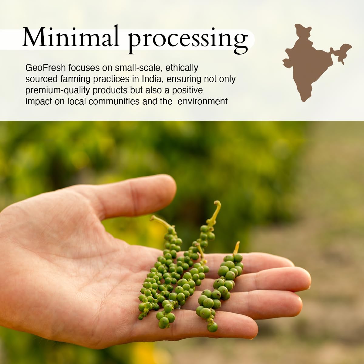 - Q: Where is the black pepper in Geo-Fresh Organic Black Pepper Powder sourced from? A: The black pepper used in Geo-Fresh Organic Black Pepper Powder is sourced from sustainable organic farms in India.