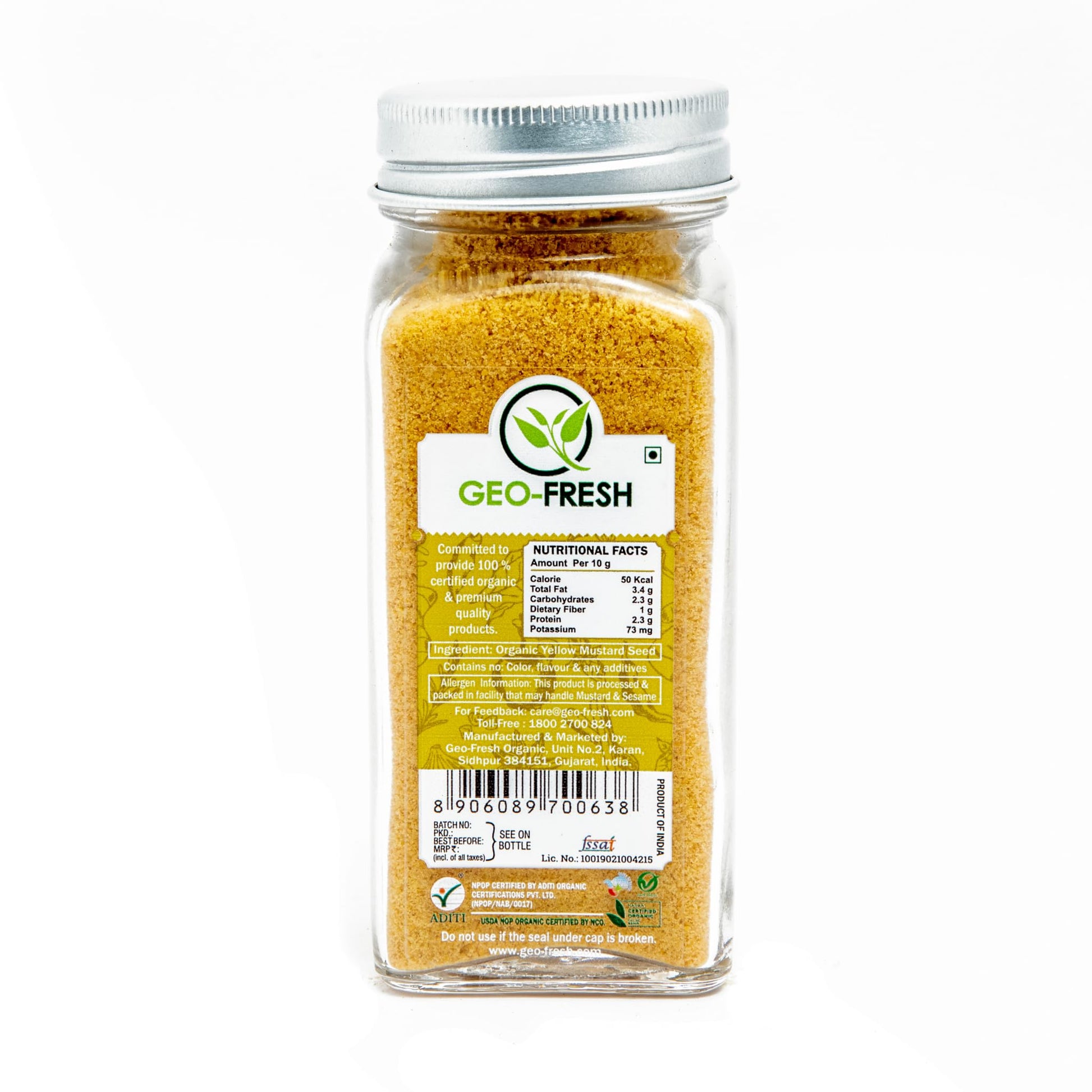 Q: What are the main ingredients in Geo-Fresh Organic Yellow Mustard Powder?A: Geo-Fresh Organic Yellow Mustard Powder is made from high-quality, organically grown mustard seeds, ensuring a pure and natural flavor without any synthetic pesticides or additives.