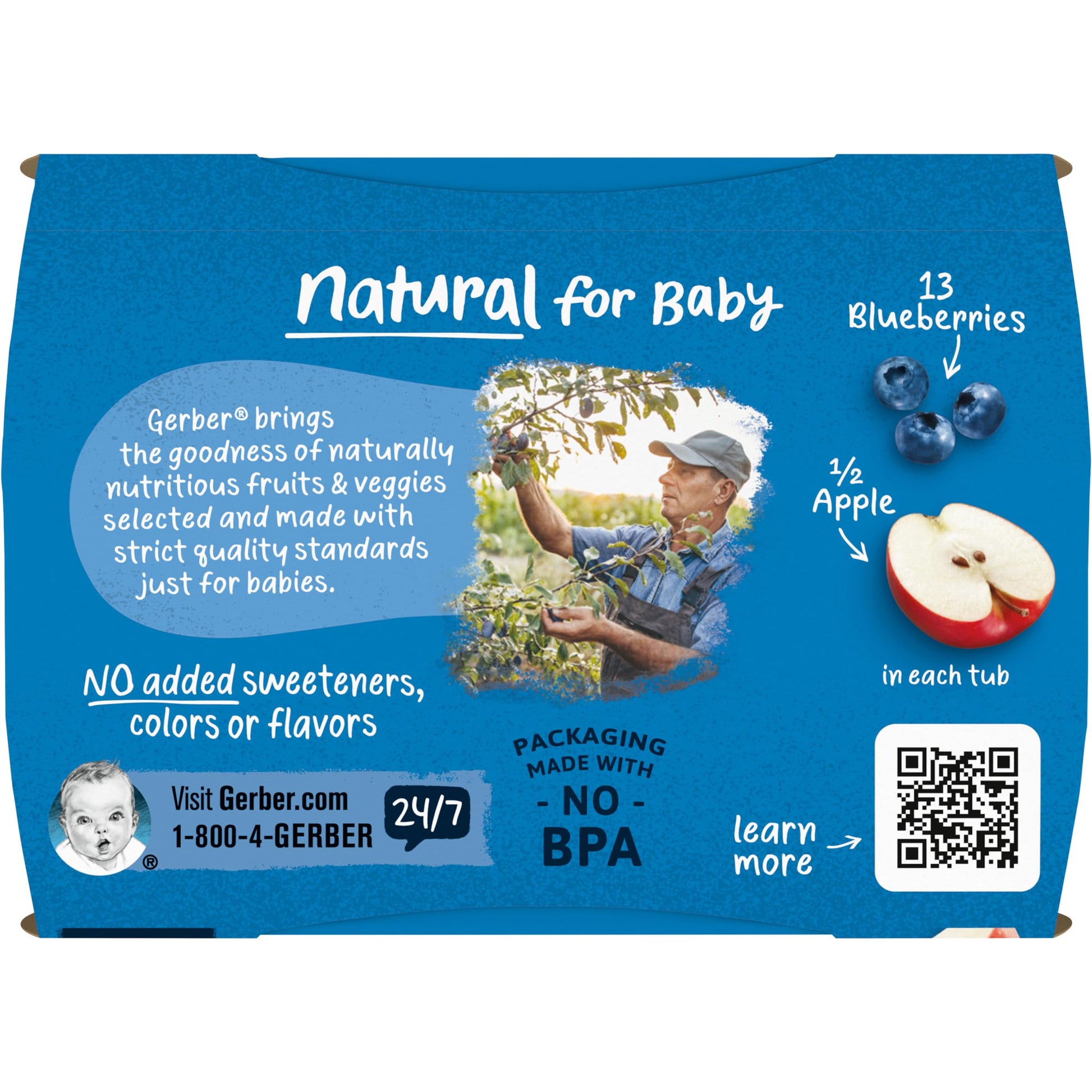 - Q: What ingredients are in Gerber 2nd Foods Apple Blueberry? A: Gerber 2nd Foods Apple Blueberry contains real fruits, specifically ½ apple and 13 blueberries in each tub. It is made without added starch, artificial flavors, or colors, ensuring a wholesome meal for your baby.