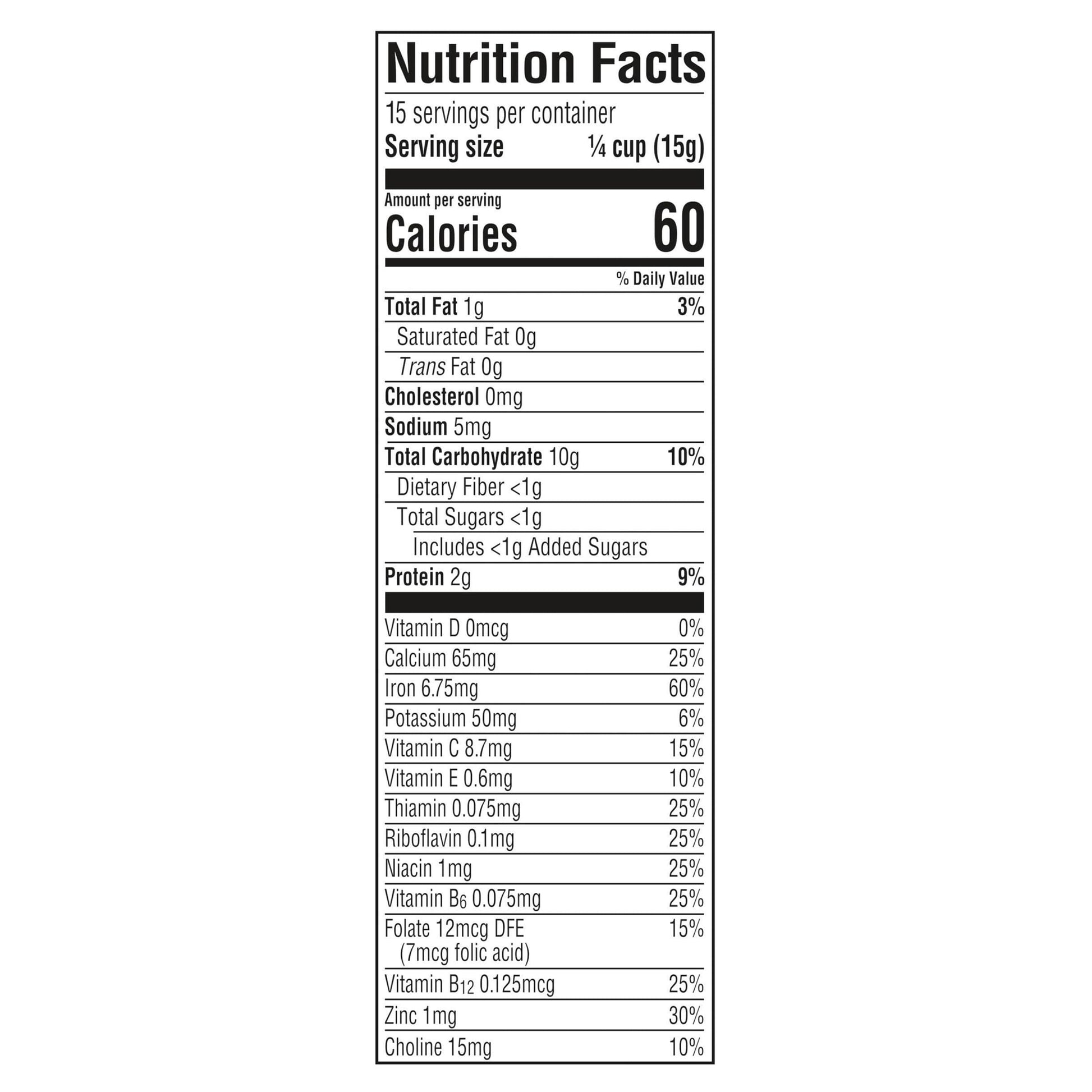 - Q: What nutritional benefits does Gerber Baby Cereal provide for infants? A: Gerber Baby Cereal is designed to support healthy growth in infants. Each serving supplies a significant amount of iron—90% of a baby's daily value—along with calcium, zinc, and essential vitamins, making it a nutritious choice for early solid food introduction.