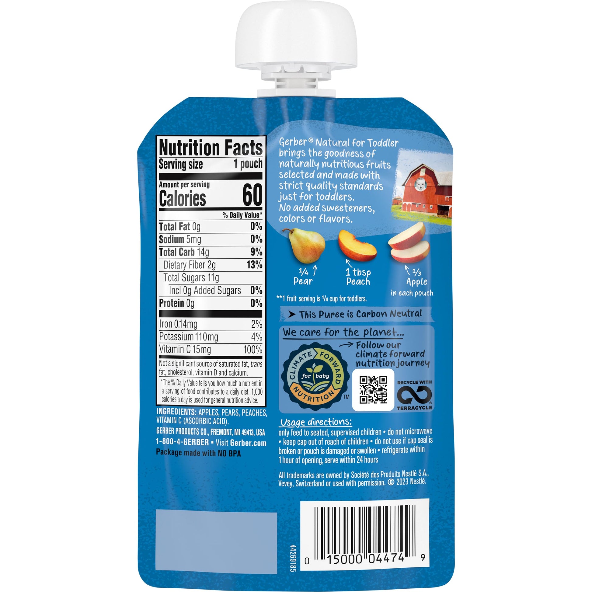 Gerber Apple Pear Peach Toddler Food Is A Delicious Fruit Puree That Helps Toddlers Feed Themselves. Each Toddler Pouch Provides Two Toddler Fruit Servings From 1/3 Apple, 1/4 Pear And 1 Tablespoon Peach For A Naturally Sweet, Fruity Flavor That Toddlers Love. Made With Non-Gmo Ingredients, This Gerber Puree Contains No Artificial Colors, Flavors Or Sweeteners And No Added Starch. Toddler Food Pouches With Clear Windows Let You See The Goodness Your Toddler Is Eating. The Smart Flow Spout On The Baby Food Pouch Gives Tiny Hands Big Control To Make Feeding Skills Easier And Less Messy. The Pouches Are Easy To Toss Into A Diaper Bag Or Purse For Snacking On The Go. Feed Your Toddler From The Pouch While Seated. Refrigerate Leftover Gerber Toddler Food Within 1 Hour Of Opening And Serve Within 24 Hours.
