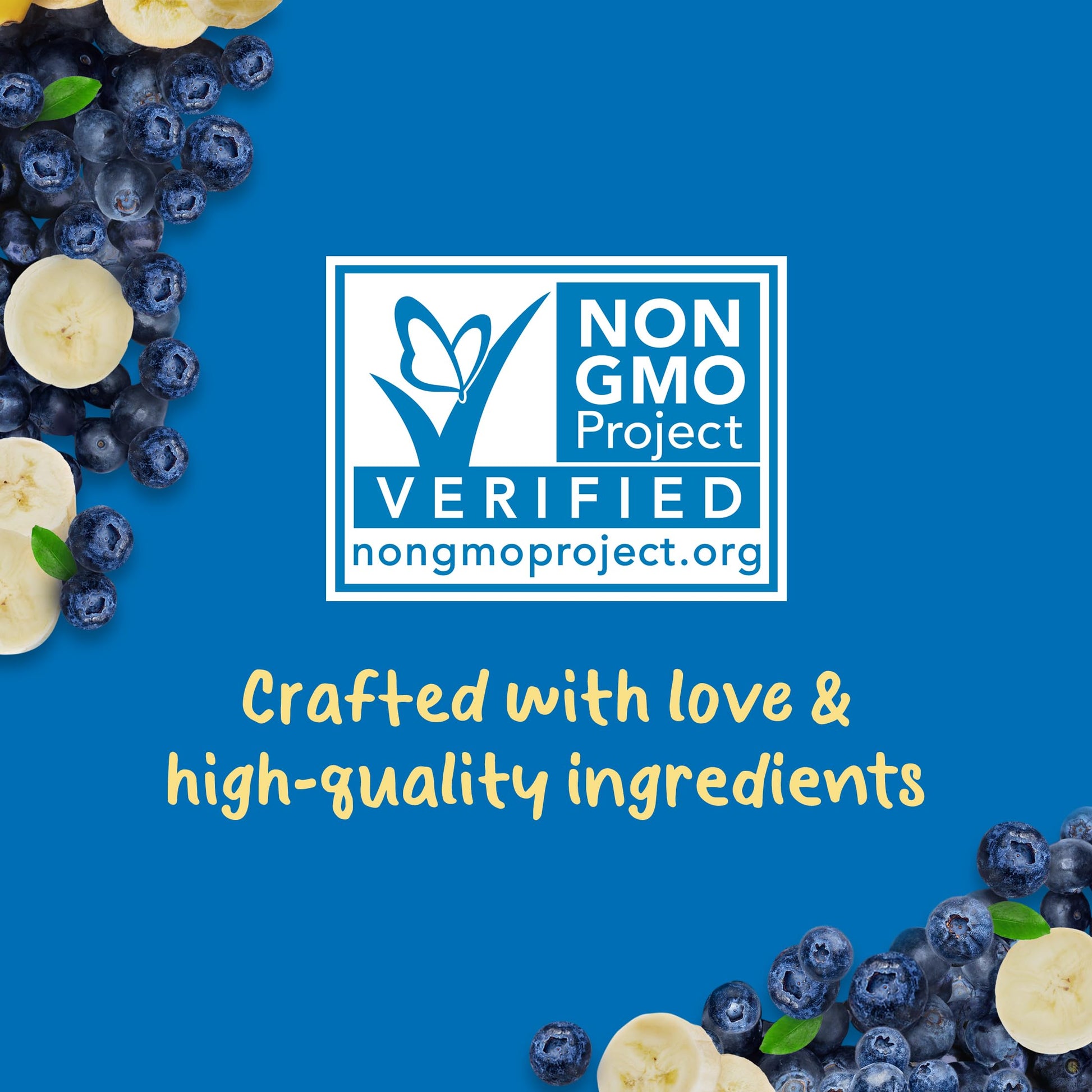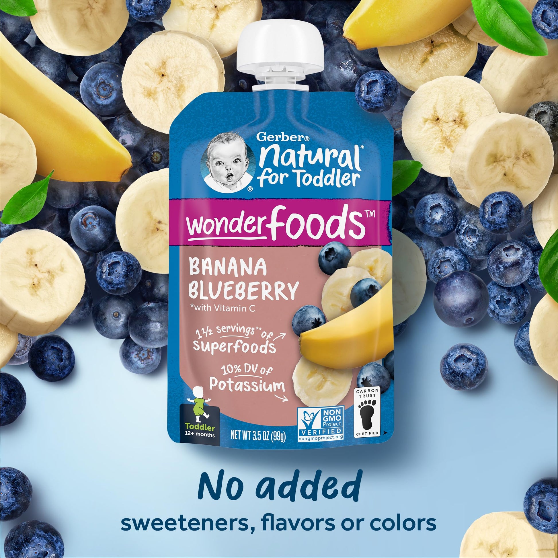 Q: What nutritional benefits does Gerber Banana Blueberry Puree offer?A: This baby food pouch provides 40% of the daily value of potassium and 30% of the daily value of vitamin C, contributing to your baby's healthy growth and development.