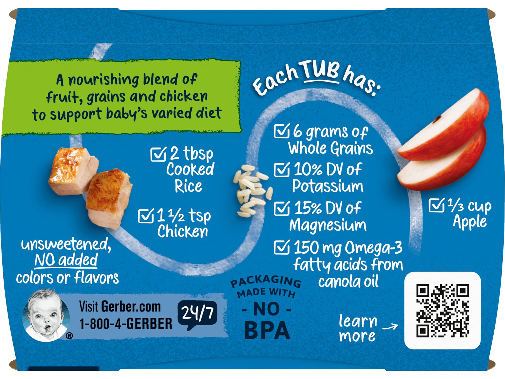 Gerber Mealtime For Baby 2Nd Foods Powerblend Baby Food Tubs, Apple Chicken Flavor, 2 - 4 Ounce Tubs Per Pack: Our Gerber 2Nd Foods Mealtime For Baby Powerblend Dinner Baby Foods Help Expose Babies To A Variety Of Tastes And Ingredient Combinations Which Is Important To Help Them Accept New Flavors. This 2Nd Foods Powerblend Apple Chicken Dinner Recipe Is Made With The Goodness Of 1/4 Cup Apple, 1 1/2 Tsp Chicken, And 2 Tbsp Cooked Rice In Each Tub. Packaging Not Made With Bpa. Our Unique Process Ensures Each Recipe Is Perfectly Cooked And Contains No Artificial Flavors Or Colors. These Gerber Mealtime Baby Food Tubs Provide A Nourishing Blend Of Fruit, Grains And Chicken That Supports Your Babys Varied Diet. Each Tub Has: 6 Grams Of Whole Grains; 10% Daily Value Of Potassium; 15% Daily Value Of Magnesium; 150 Mg Omega-3 Fatty Acids. Each Pack Contains 2 - 4 Ounce Tubs Of Gerber Mealtime For Baby Powerblend Baby Food. Directions: Refrigerate Baby Food Tubs After Opening And Use Within 2 Days.