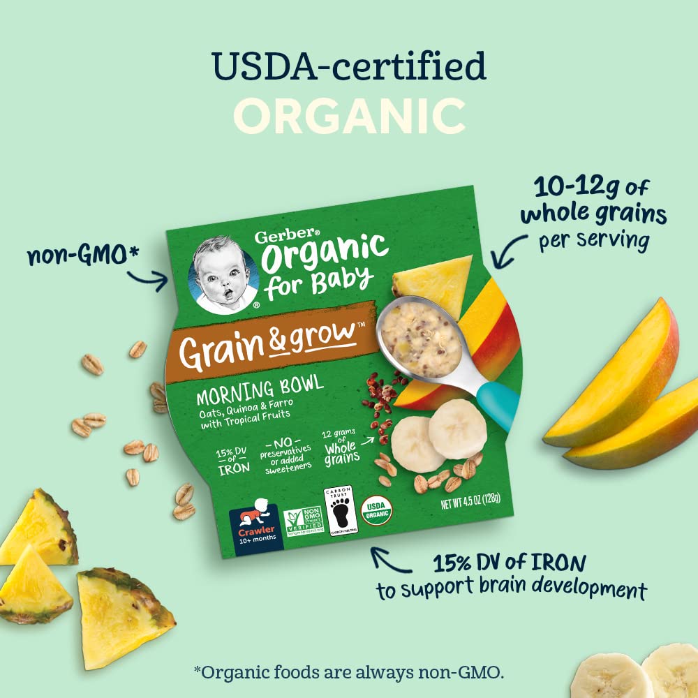 Q: What are the main ingredients in Gerber Organic Grain & Grow Morning Bowl?A: Gerber Organic Grain & Grow Morning Bowl contains oats, red quinoa, farro, and tropical fruits, providing a wholesome blend of flavors and nutrients for your baby.