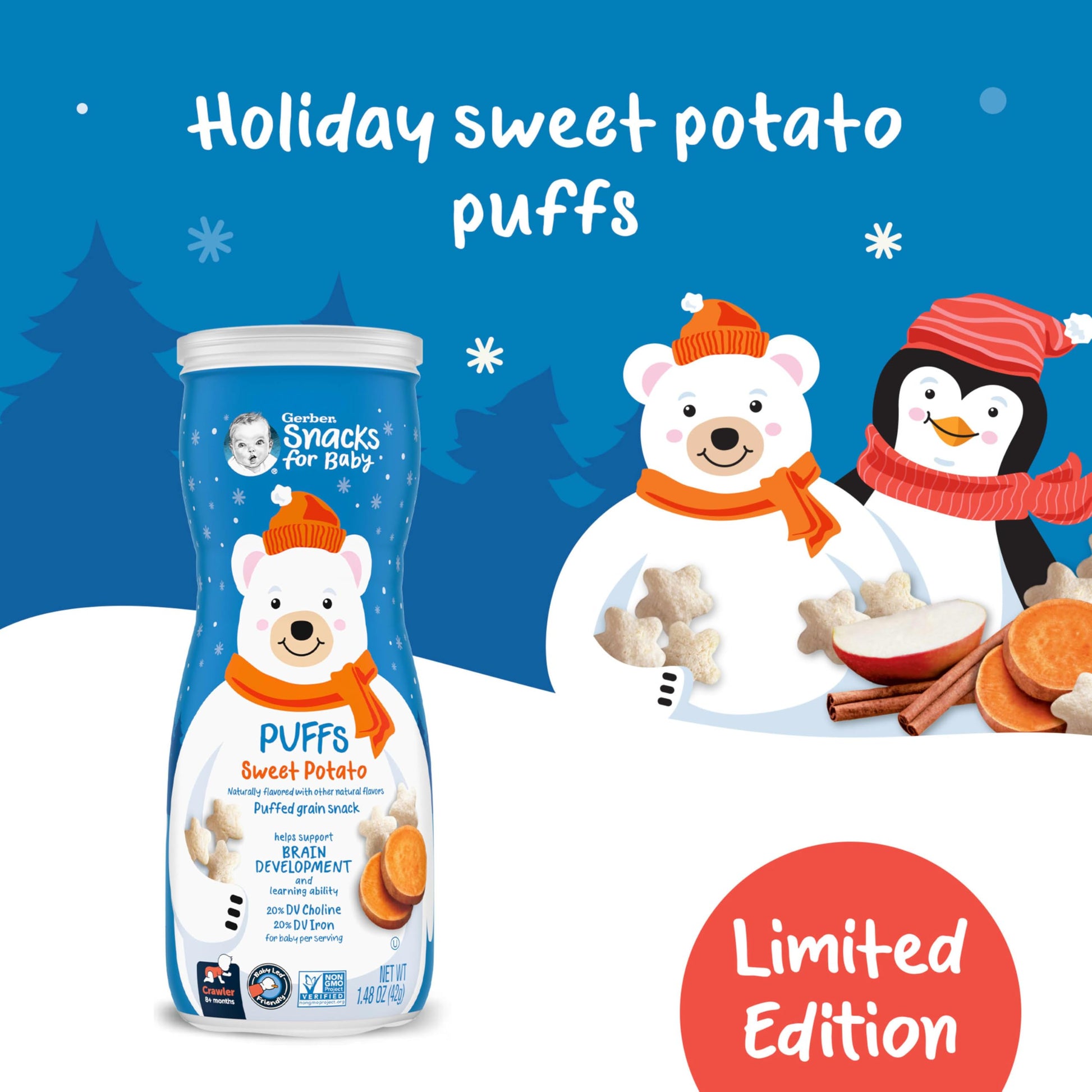 Bring Holiday Joy To Your Baby'S Snacking With Gerber Grain & Grow Holiday Puffs In Sweet Potato Flavor. These Star-Shaped Puffs Are Designed For Crawlers 8-12 Months Old, Helping To Develop Baby'S Pincer Grasp For Self-Feeding. They Dissolve Quickly In Your Baby'S Mouth And Have Iron And Choline To Support Brain Development. With Whole Grains And No Artificial Sweeteners Or Flavors, These Festive Puffs Are A Delightful Addition To Your Baby'S Snack Time.