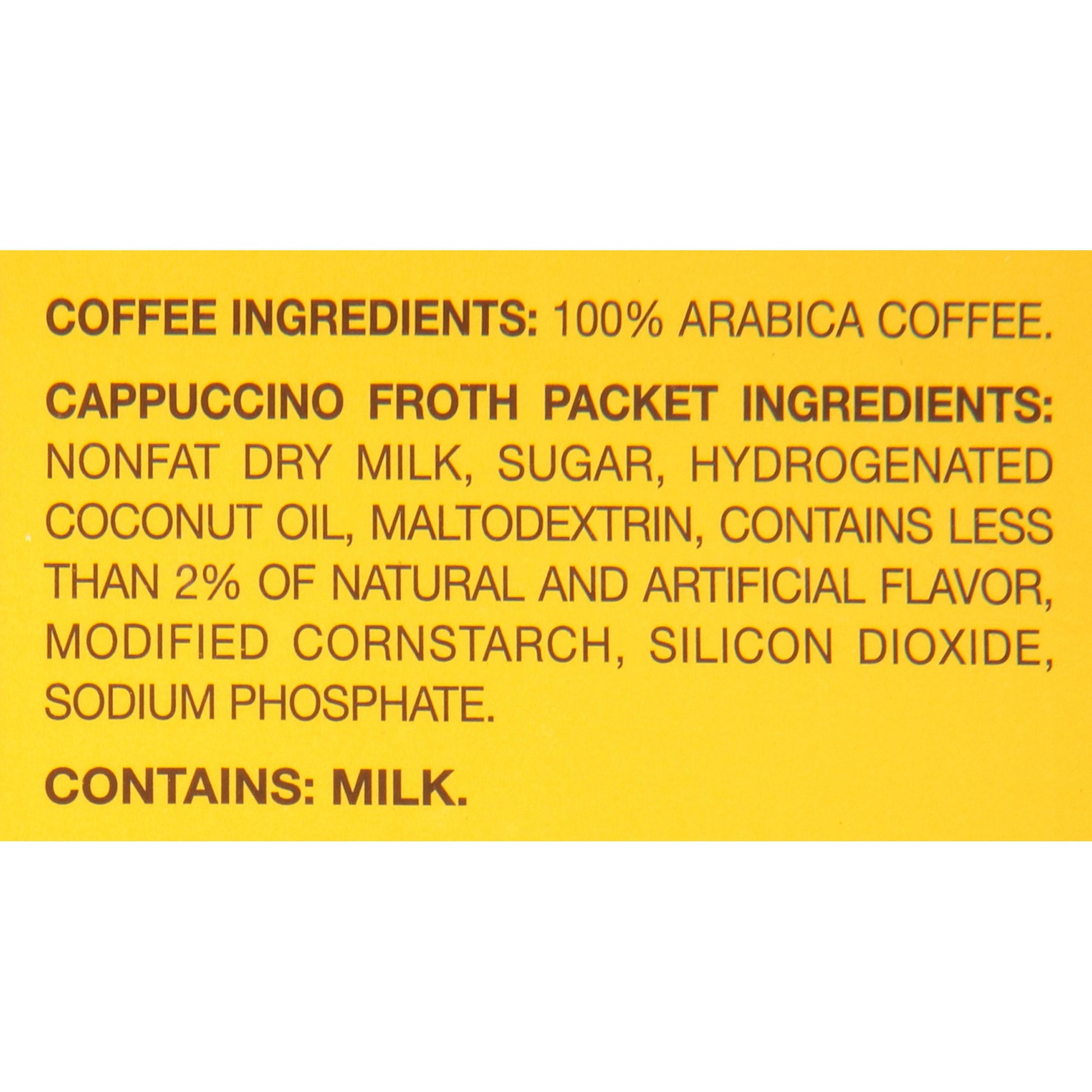 Q: What is included in the Gevalia Cappuccino Espresso K-Cup Coffee Pods package?A: The Gevalia Cappuccino Espresso K-Cup Coffee Pods package includes 9 K-Cup pods along with froth packets, allowing you to create a delicious cappuccino at home easily.