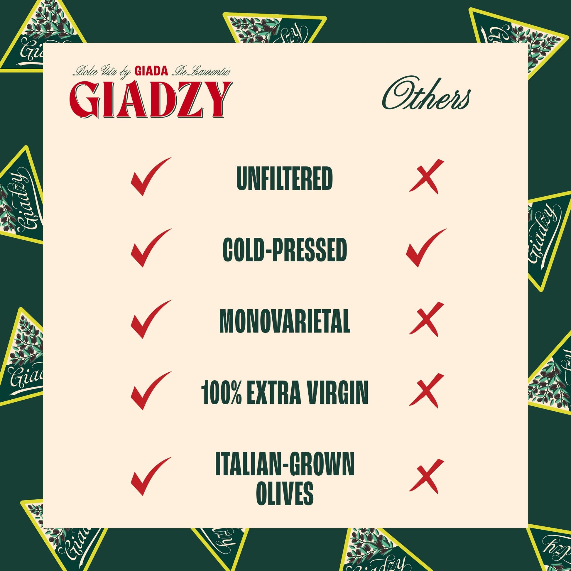- Q: What makes Giadzy extra virgin olive oil unique? A: Giadzy extra virgin olive oil is unique due to its cold-pressed extraction from native taggiasca olives, which are known for their rich and aromatic flavor. The oil is unfiltered, preserving its natural antioxidants and polyphenols, making it a healthy choice for cooking and drizzling.