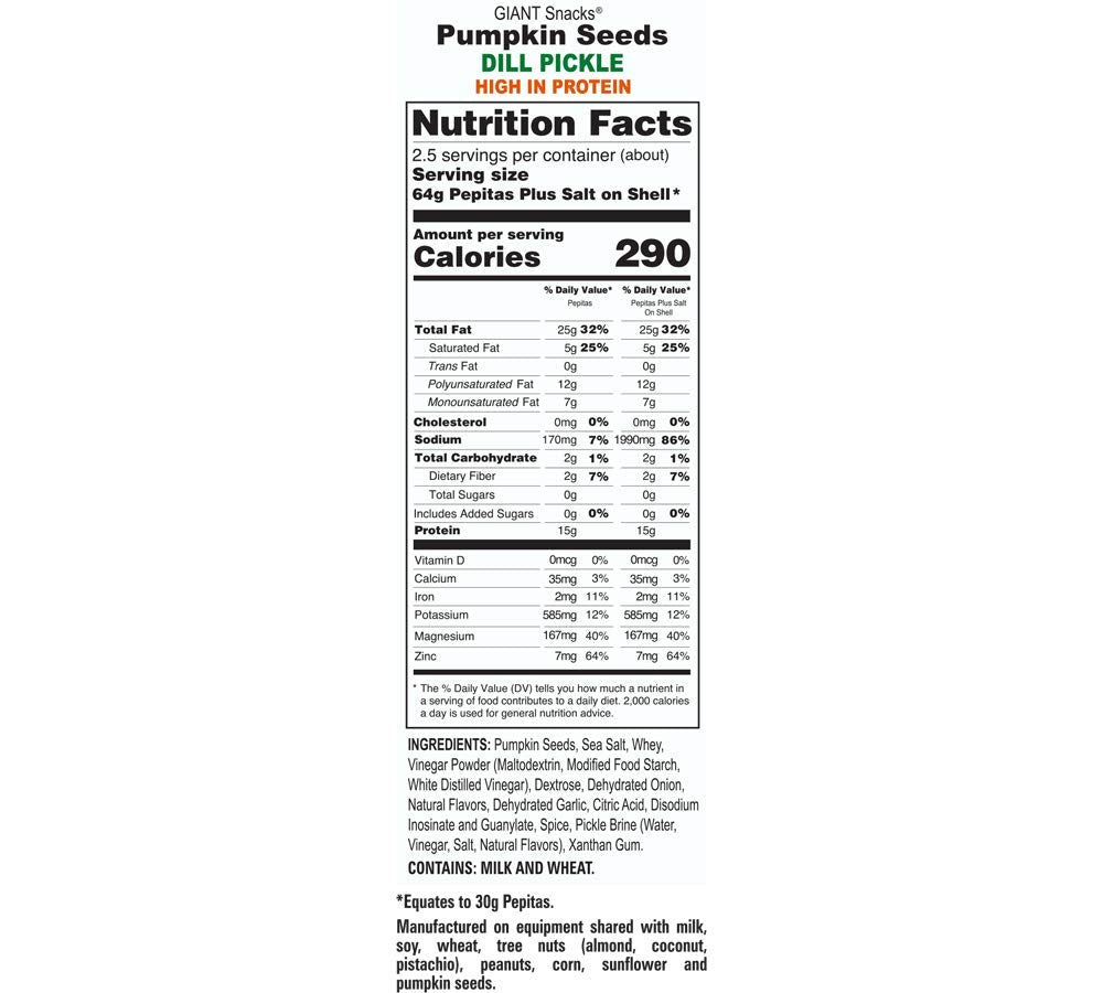 Q: What makes GIANTS Pumpkin Seeds Dill Pickle Flavored unique?A: GIANTS Pumpkin Seeds Dill Pickle Flavored are unique because they combine the tangy taste of dill pickles with the crunchy texture of jumbo pumpkin seeds, offering a delicious snack that's both flavorful and satisfying.