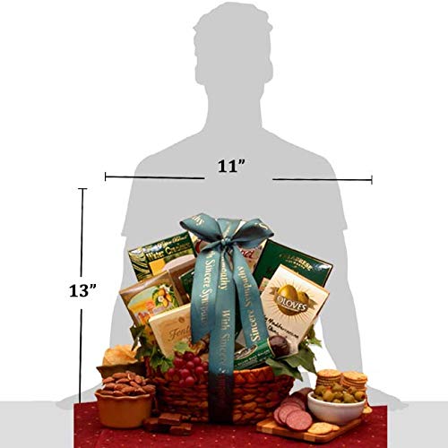 - Q: What kind of ribbon is used on the gift basket? A: The gift basket comes with a hunter green ribbon that features the words 'With Sincere Sympathy'.