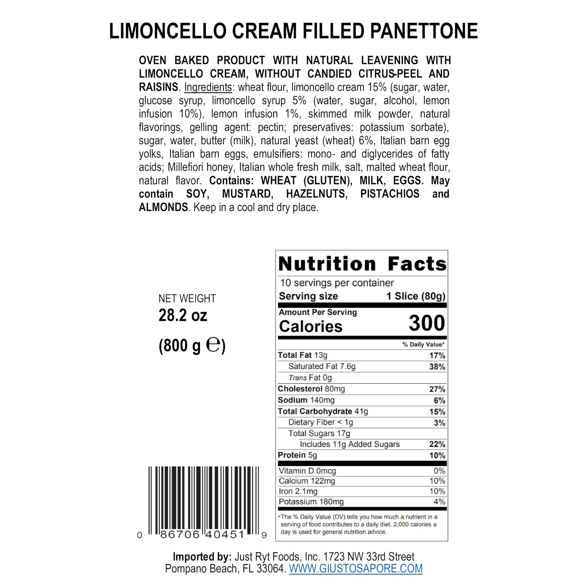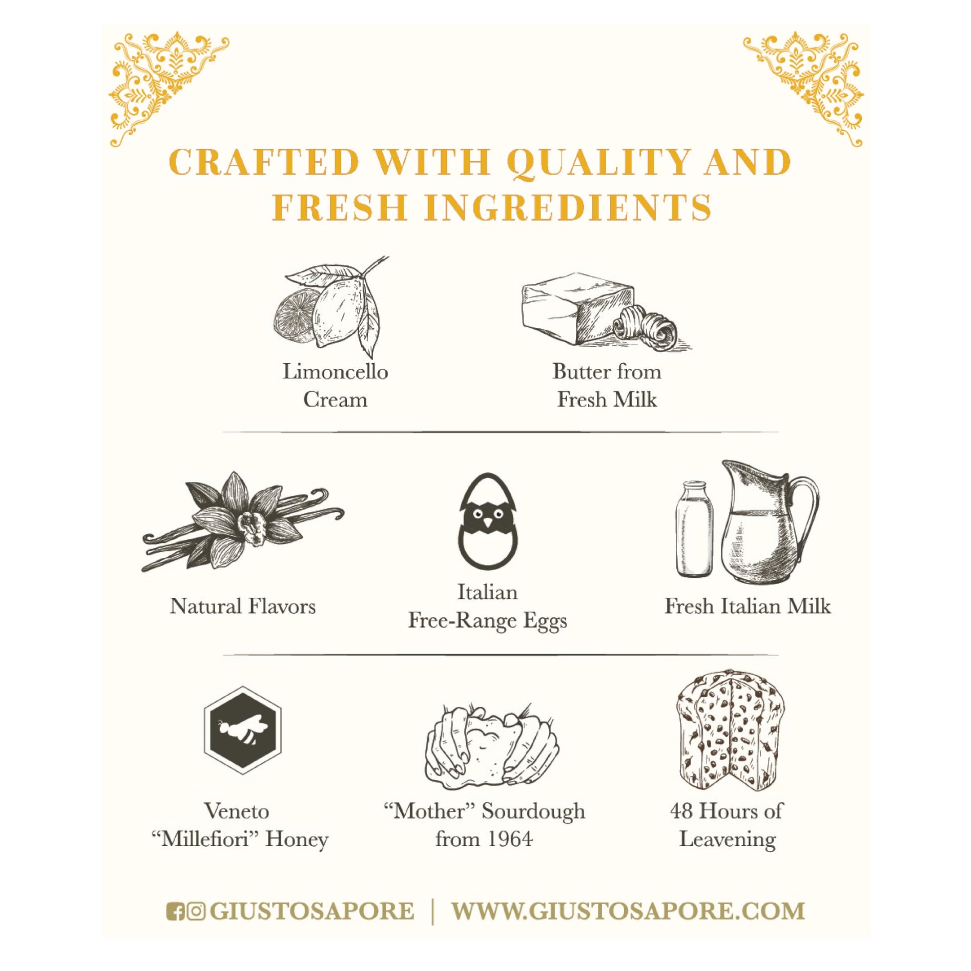 - Q: What are the main ingredients in Giusto Sapore Panettone? A: Giusto Sapore Panettone is made with high-quality natural ingredients including imported candied orange peel from Calabria, premium raisins, and carefully selected fruit and nut flour.