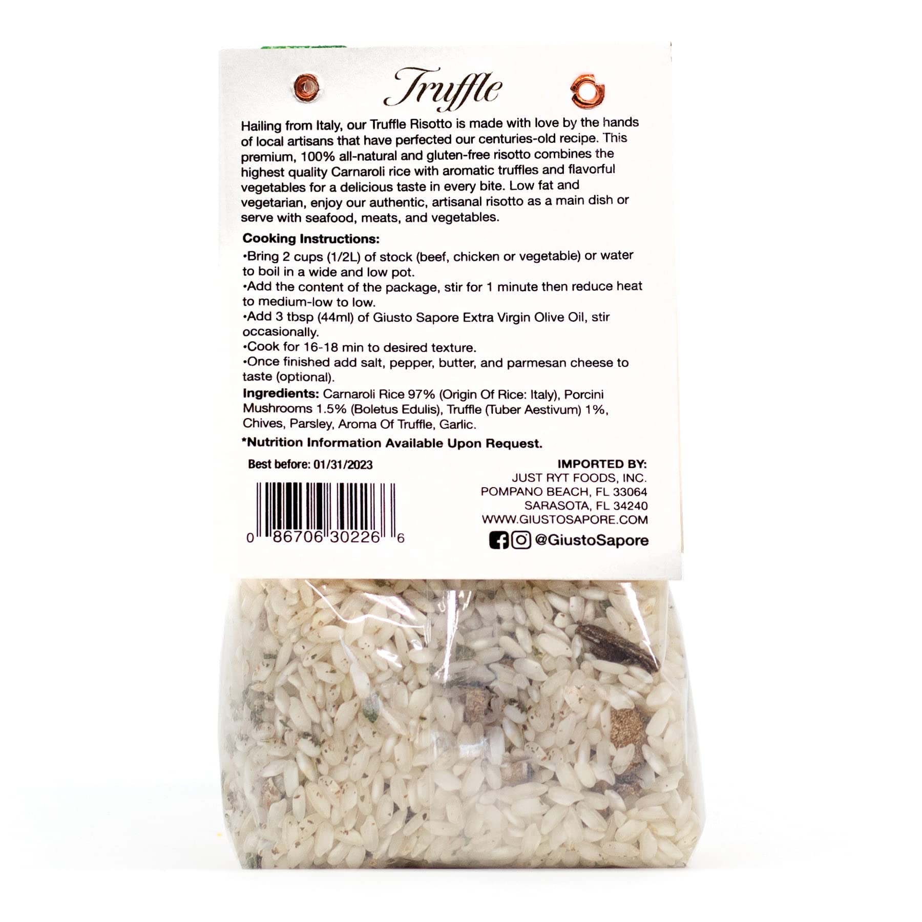 Q: What makes Giusto Sapore Truffle Risotto different from other risottos?A: Giusto Sapore Truffle Risotto is made from premium Carnaroli Rice sourced from Italy, ensuring a high-quality texture and flavor. Its gourmet truffle infusion offers a unique taste that sets it apart from other risottos, providing an authentic Italian experience in every bite.