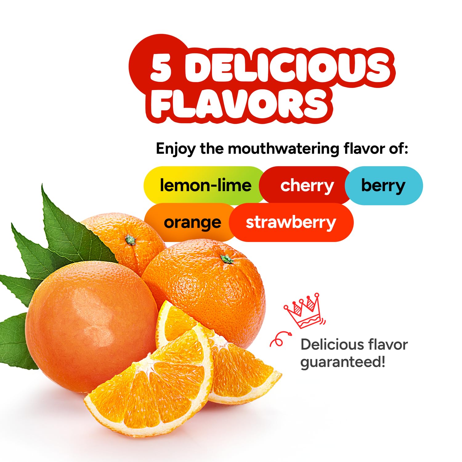 Key Features:- Burst of Flavors: Enjoy five delightful tastes - Orange, Lemon-Lime, Strawberry, Berry, and Cherry.