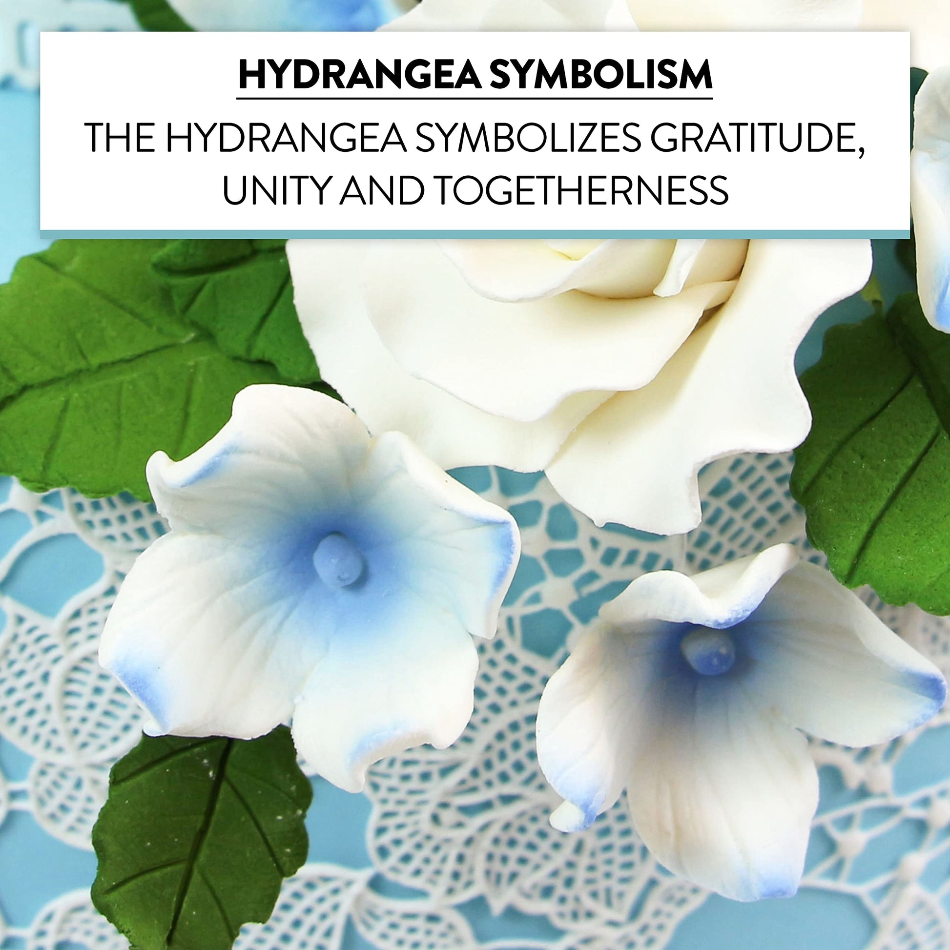 Q: Are these sugar flowers edible?A: The hydrangea blossoms are primarily for decorative purposes and may contain non-edible floral wire, stamen, or pearls. It's recommended to remove these elements before serving.