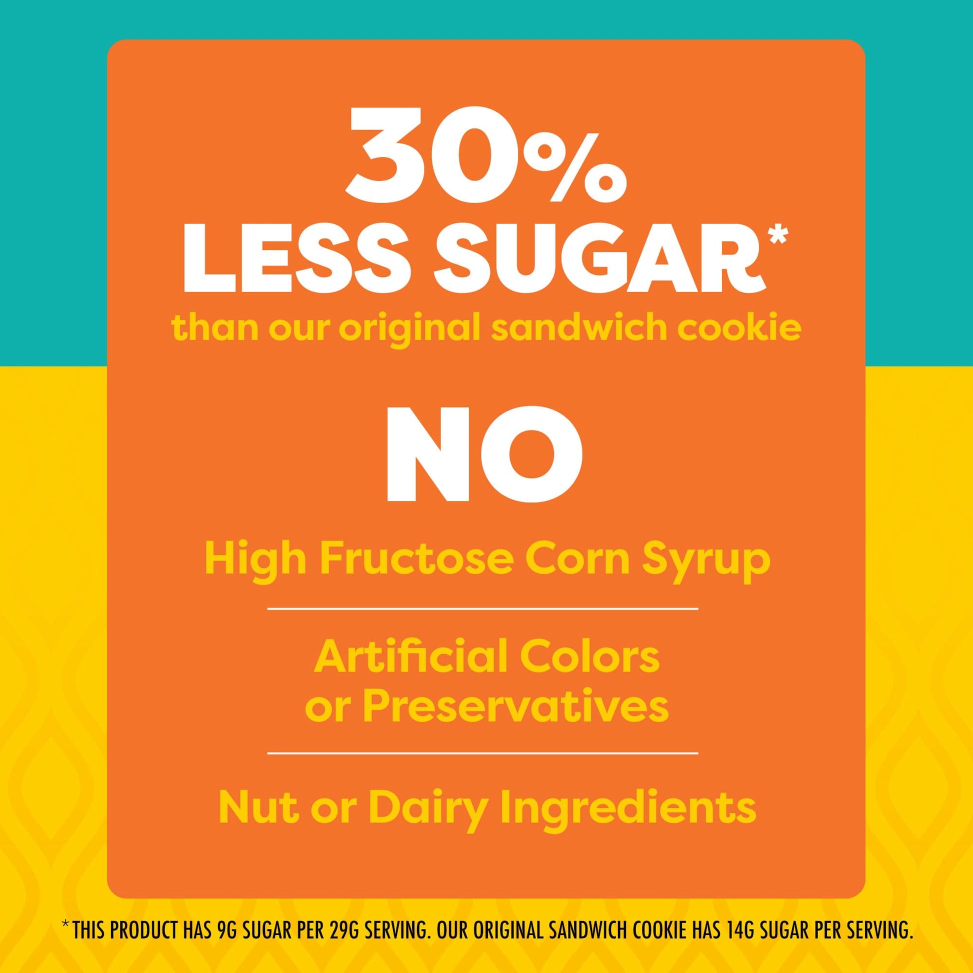 Q: What is the sugar content in Glutino Lemon Pie Flavored Sandwich Cookies?A: These cookies contain 9 grams of sugar per 29-gram serving, which is 25% less sugar than leading sandwich cookies.
