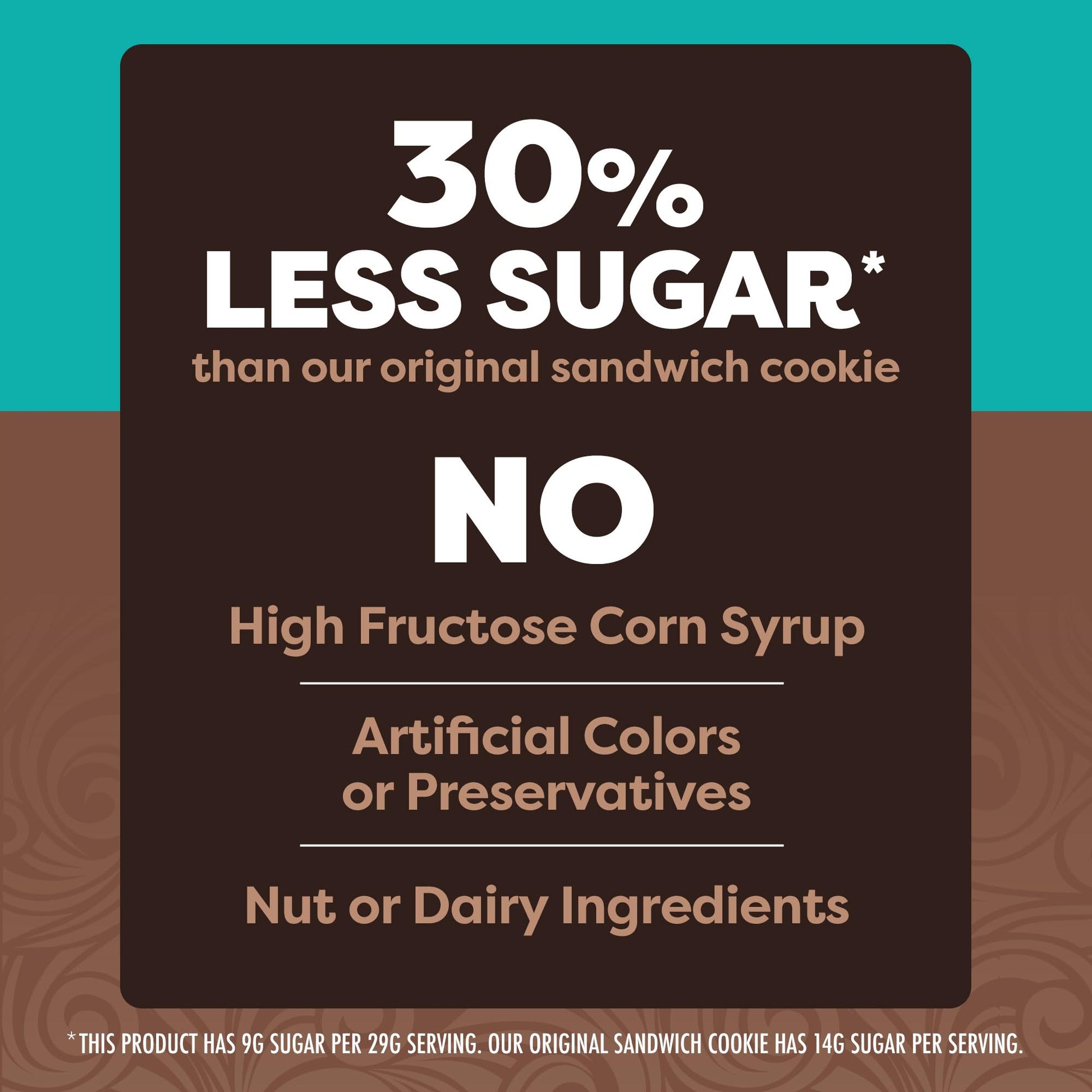 Q: How much sugar do Glutino Swiss Miss cookies contain?A: Each serving of Glutino Swiss Miss cookies contains 9 grams of sugar, which is 25% less sugar than leading sandwich cookies.