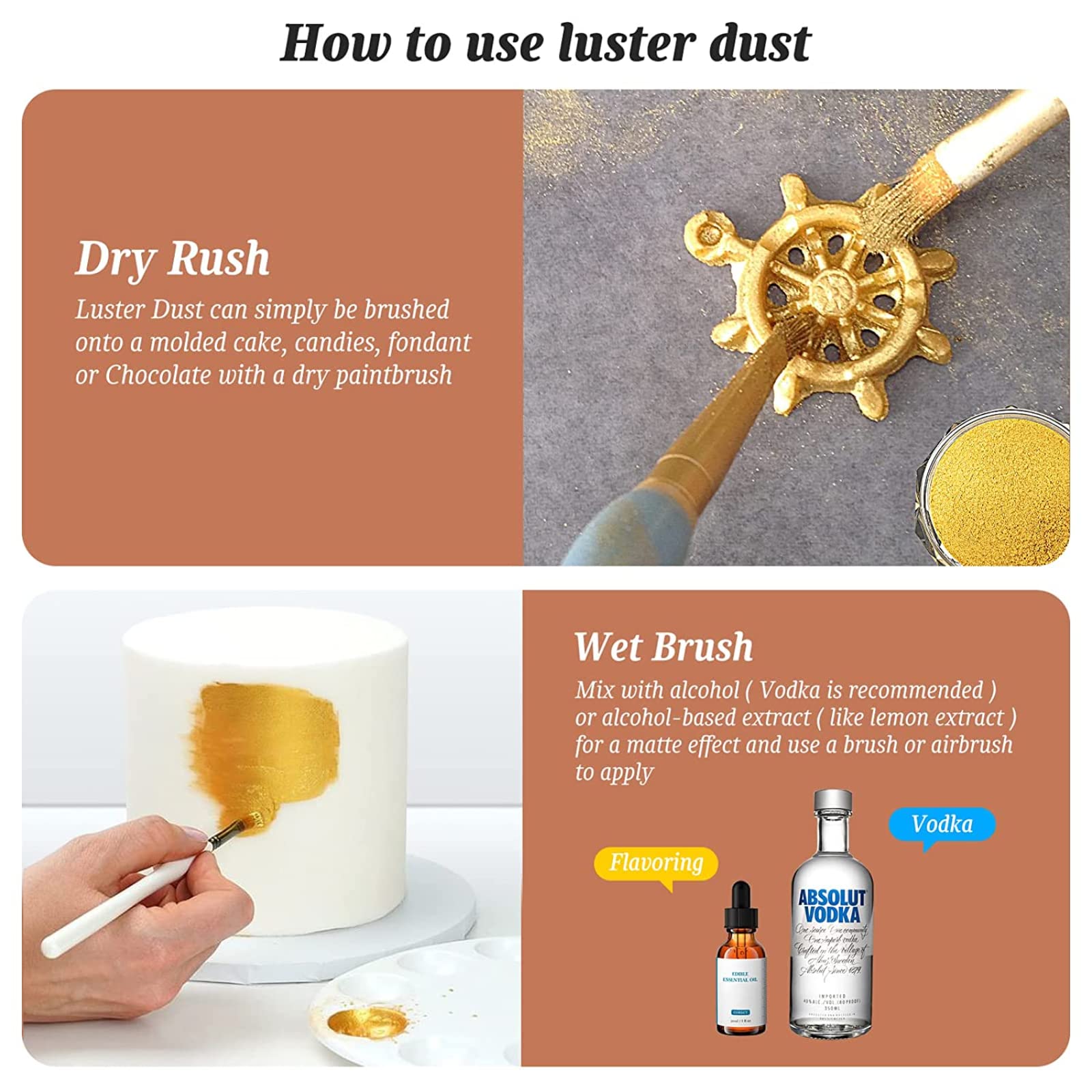 Q: How do I mix the luster dust for painting on cakes?A: To use the luster dust for painting, mix it with a small amount of oil-based food flavoring or alcohol like vodka. This will create a liquid that can be brushed or sprayed onto your cake for a shimmering effect.