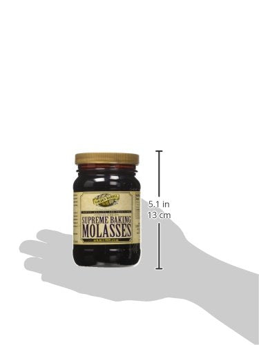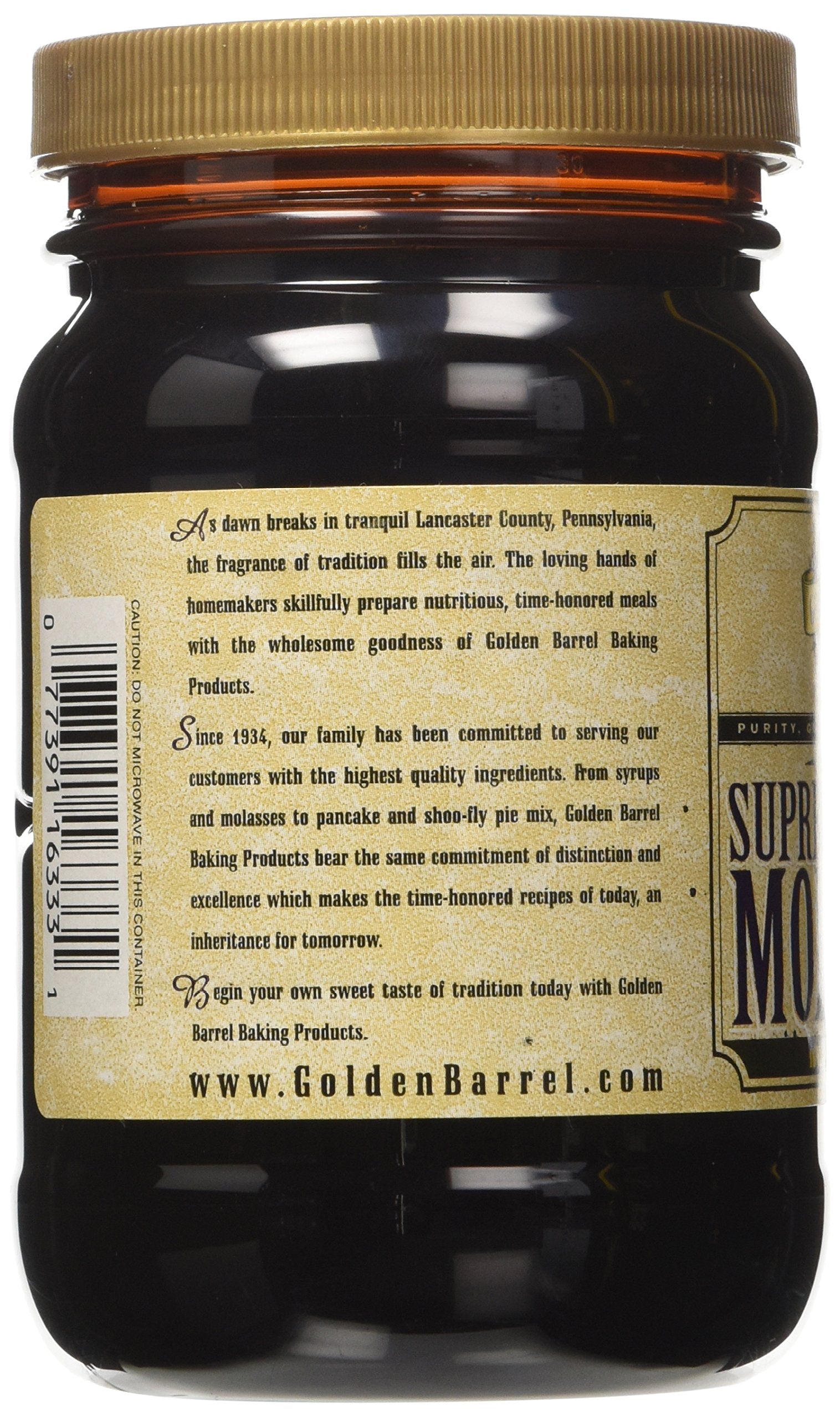 One 16 oz. Wide mouth easy pour plastic jar of golden barrel supreme baking molases. This molases is made from juice extracted sugar cane, then boiled, filtered and evaporated to the consistency of sweet mellow syrup, rich brown in color and uniquely tart-sweet in flavor. This is a sulfur free molases which is delicious for baking and candy making. No preservatives are used in the process or added to the product. Generally considered the worlds finest molases.