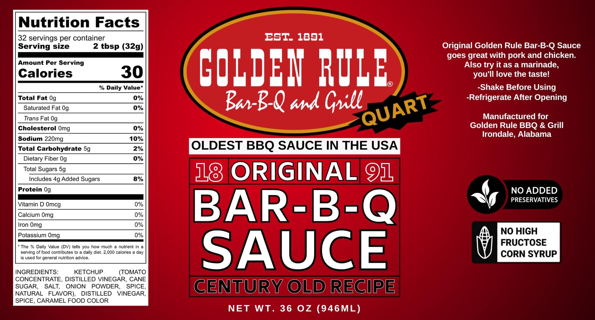 Discover the exceptional taste of Americas oldest BBQ Sauce, a time-honored tradition crafted by Golden Rule BBQ. This authentic barbecue sauce is not just a condiment, its a culinary experience that brings your grilled delights to life. Infused with rich flavors and a secret family recipe passed down through generations, this BBQ Sauce elevates your cooking to new heights, whether slathered on ribs, chicken, or burgers. Golden Rule BBQ Sauce stands out with its robust flavor profile that perfectly balances sweet and tangy notes. Its crafted to complement your favorite meats and ignite your taste buds with every bite, making it an essential staple for barbecue enthusiasts. From casual family gatherings to grand grilling events, this sauce enhances the flavors of your dishes while paying homage to classic barbecue traditions. Transform simple meals into unforgettable feasts with this legendary sauce. Crafted with quality ingredients, this BBQ Sauce not only promises great taste but also authenticity in every bottle. Perfect for slow-cooked, oven-roasted, or lightly grilled dishes, it provides versatility to suit various cooking methods. Experience the remarkable taste of Golden Rules barbecue sauce and bring a piece of barbecue history to your kitchen. Try it today and let it redefine your grilling experience!