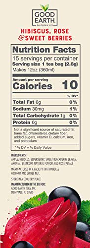 Q: What are the main ingredients in Good Earth Sensorials Hibiscus, Rose & Sweet Berries Herbal Tea?A: The main ingredients include opulent hibiscus, red berries, and light floral rose petals, combined with natural flavoring. This herbal tea is free from artificial flavors, colors, or ingredients.