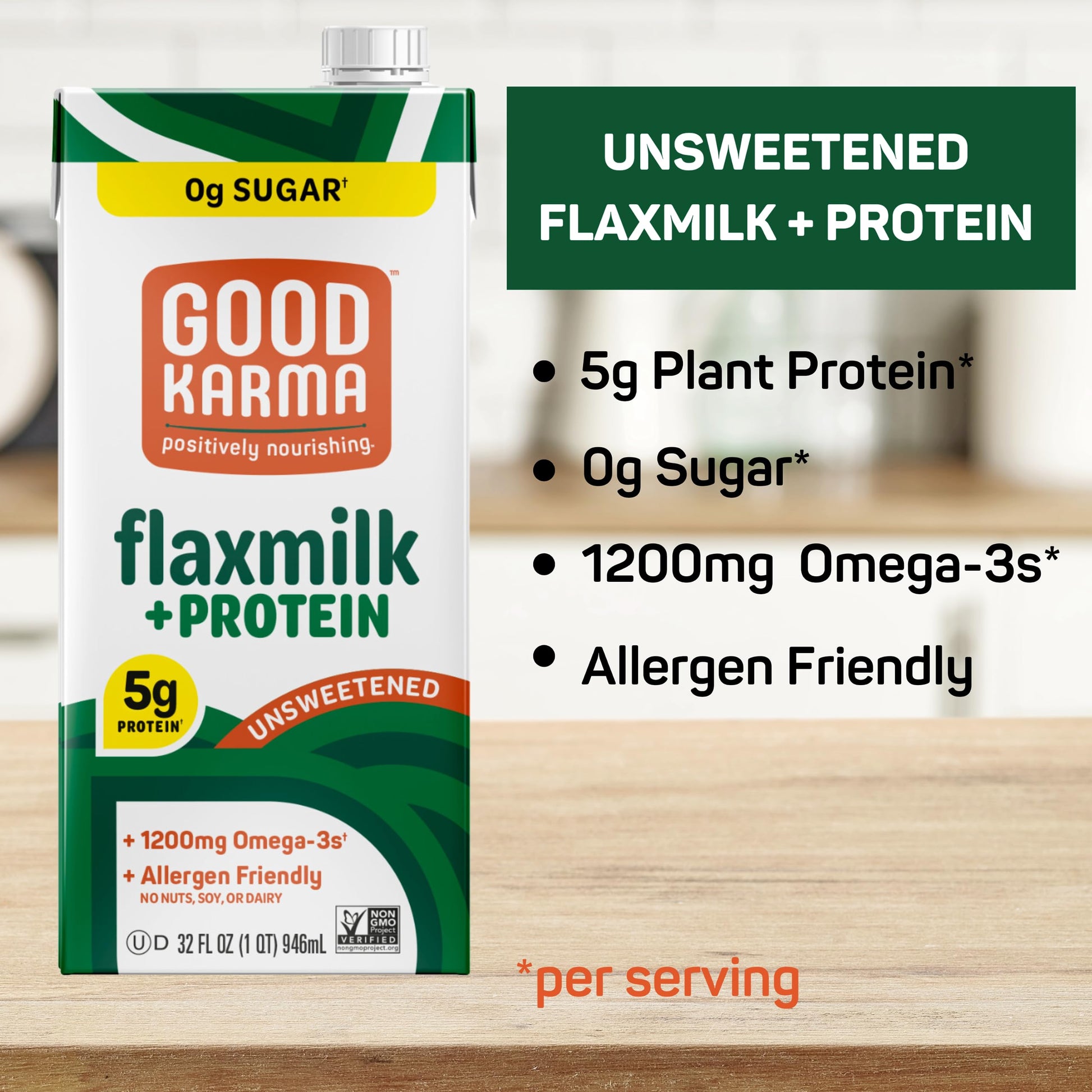Contains: 6- 32 Ounce Containers of Good Karma Unsweetened Flaxmilk +Protein. Keep your pantry stocked with this shelf-stable milk alternative, no need to refrigerate until after you open. Best served chilled | A Better Nondairy Milk: Our Flaxmilk + Protein is a more planet-friendly choice compared to almond milk as flax uses considerably less water to grow than almonds | Pour on the Goodness: Deliciously smooth, keto-friendly plant-based milk packed with 5g of vegan protein, 1200mg Omega-3 healthy fats, plus calcium and vitamins A, D and B13 | Creamy and Delicious: Our versatile Flaxmilk +Protein has a neutral taste that doesn