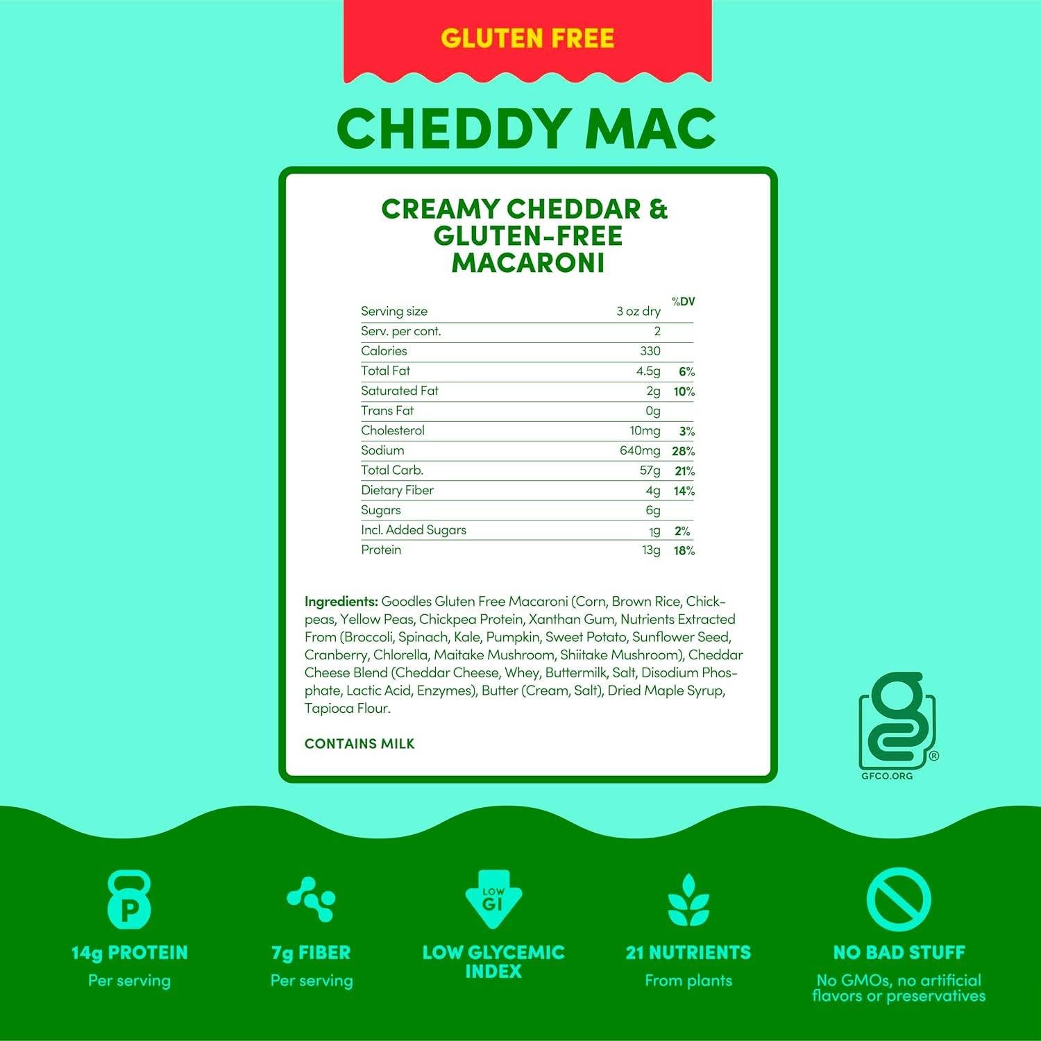 Q: How does GOODLES Gluten-Free Cheddy Mac compare to traditional macaroni and cheese?A: GOODLES Gluten-Free Cheddy Mac offers the same traditional noodle texture and flavor while being gluten-free and packed with more nutrients, making it a healthier alternative.