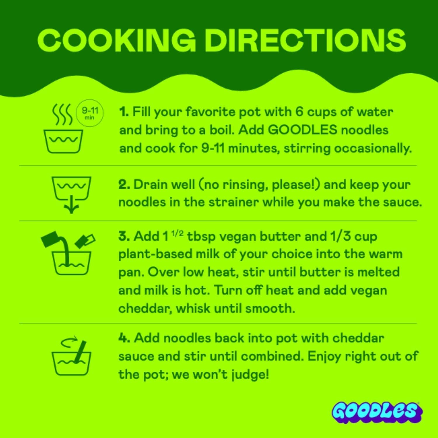 Q: What are the nutritional benefits of Goodles Vegan Mac & Cheese?A: Goodles Vegan Is Believin’ Mac & Cheese is packed with 12g of protein, 7g of fiber with prebiotics, and 21 essential nutrients from plants, making it a nutrient-rich meal for both adults and children.