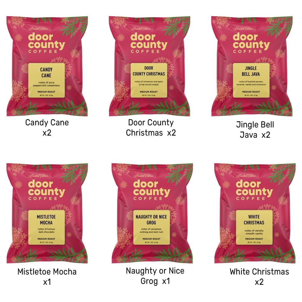The Door County Coffee Holiday Sampler Pack Is The Perfect Way To A Variety Of Holiday Coffees! We Completely Understand That You Might Be Hesitant To Purchase Coffees You Haven'T Tried Before. You Simply May Not Even Know Where To Begin With Our Many Coffee Varieties! We'Ve Got You Covered, With This One Perfect Sampler Pack Of Our Best-Sellers! Each Sampler Pack Includes One Bag Of Each Of The Following Coffees: Candy Cane, Door County Christmas, Jingle Bell Java, Miseltoe Mocha, Naught Or Nice Grog, And White Christmas