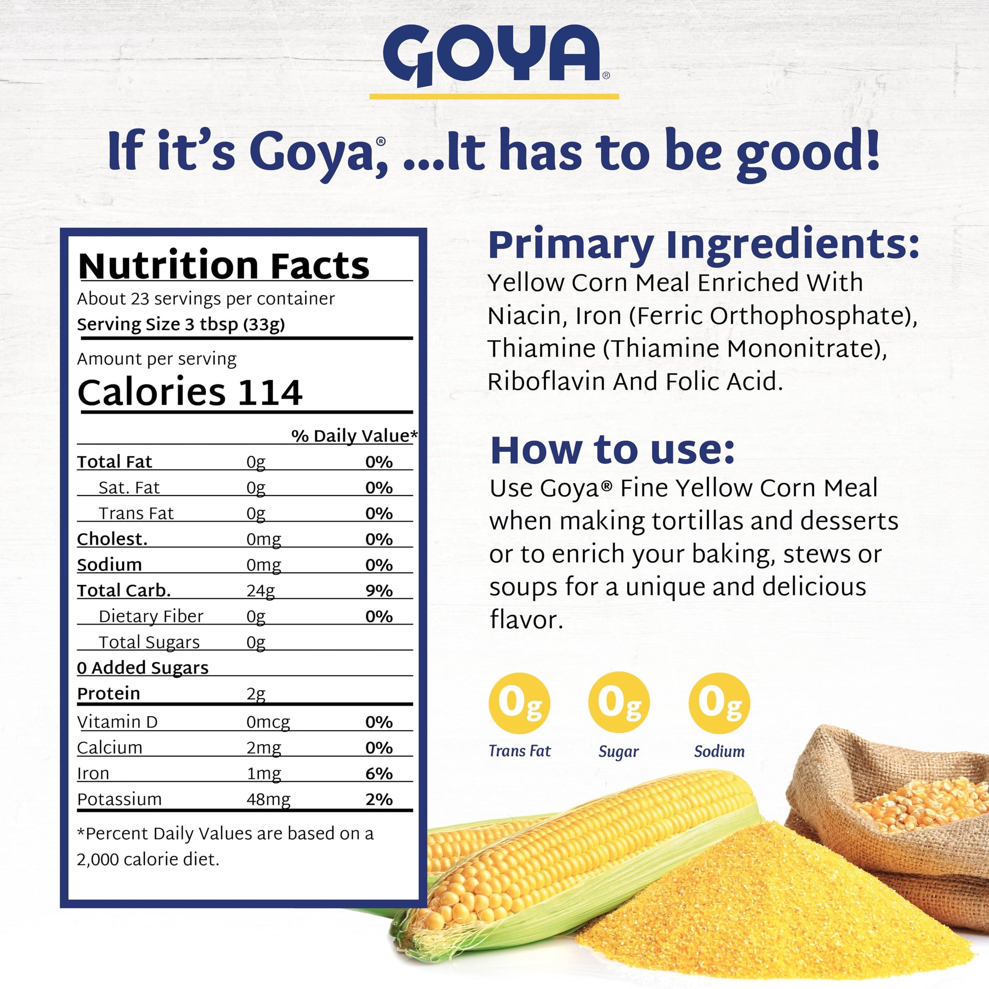 - Q: What are the nutritional benefits of Goya Fine Yellow Corn Meal? A: Goya Fine Yellow Corn Meal is fat-free, cholesterol-free, and sodium-free. It is a source of carbohydrates and can be part of a balanced diet.