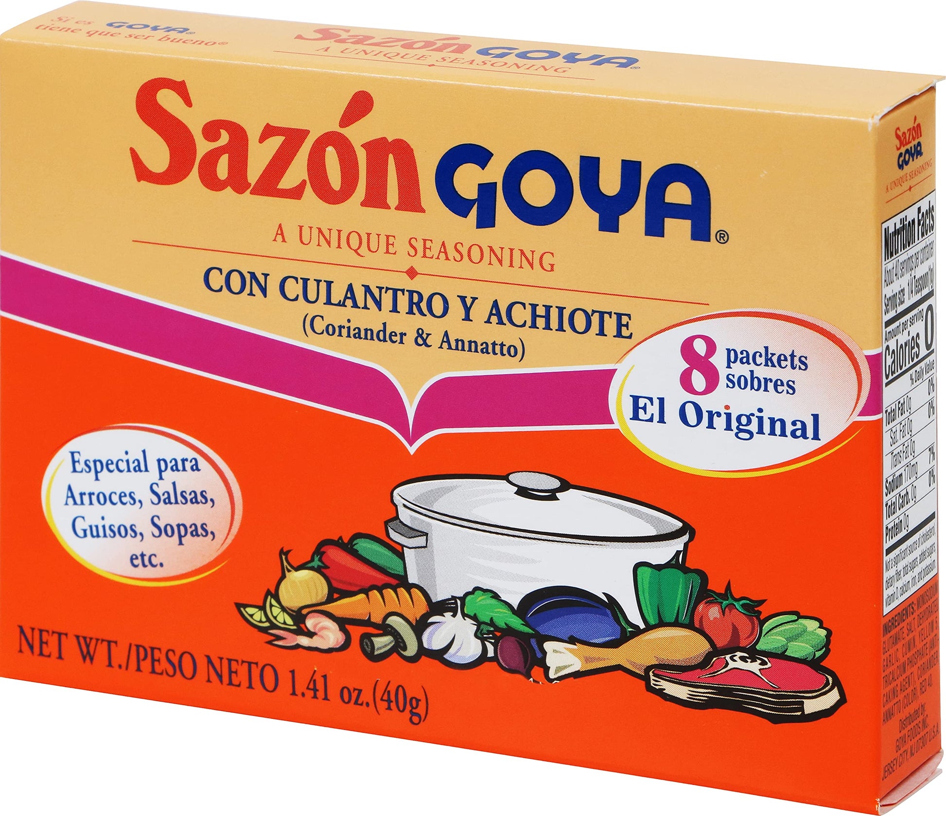 Goya Sazon With Coriander And Annatto - 1.41 Oz. Box, 36 Per Case Inside This Box Youll Find The Secret To Creating The Authentic Flavors Of Latino Cuisine. Goya Sazons Special Blend Of Seasonings Makes Every Dish It Graces Taste Truly Exceptional. Just One Packet Makes A World Of Difference. 8 Envelopes Per Box