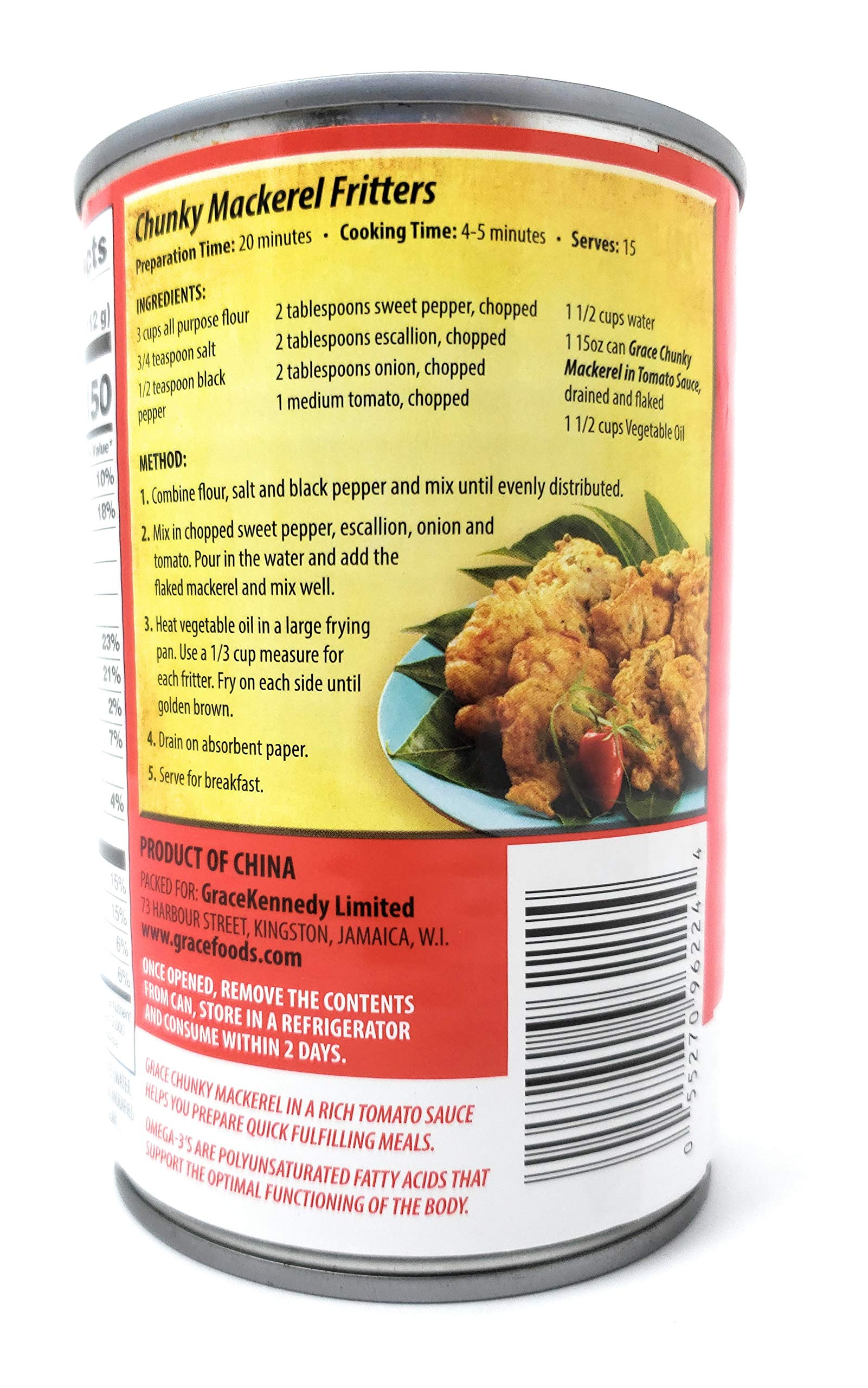 Q: Where is Grace Mackerel sourced from?A: Grace Mackerel in Tomato Sauce is produced by Grace Foods, a brand with Jamaican heritage. The product combines authentic Caribbean flavors with high-quality manufacturing in China, ensuring a delicious and reliable canned fish option.