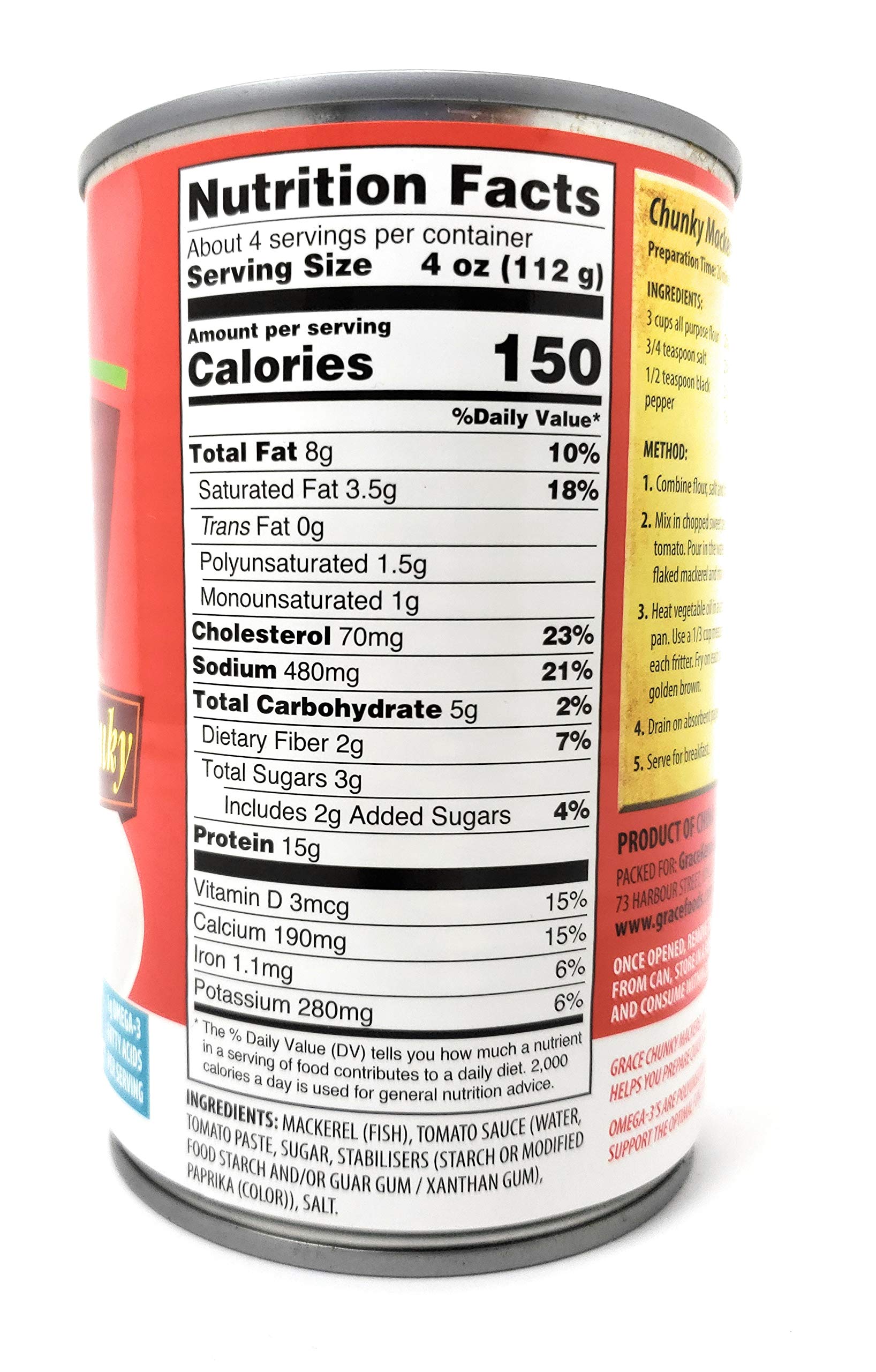 Q: What is Grace Chunky Mackerel in Tomato Sauce made of?A: Grace Chunky Mackerel in Tomato Sauce is made from high-quality jack mackerel, rich tomato sauce, and essential seasonings. It offers a nutritious meal packed with protein and omega-3 fatty acids.