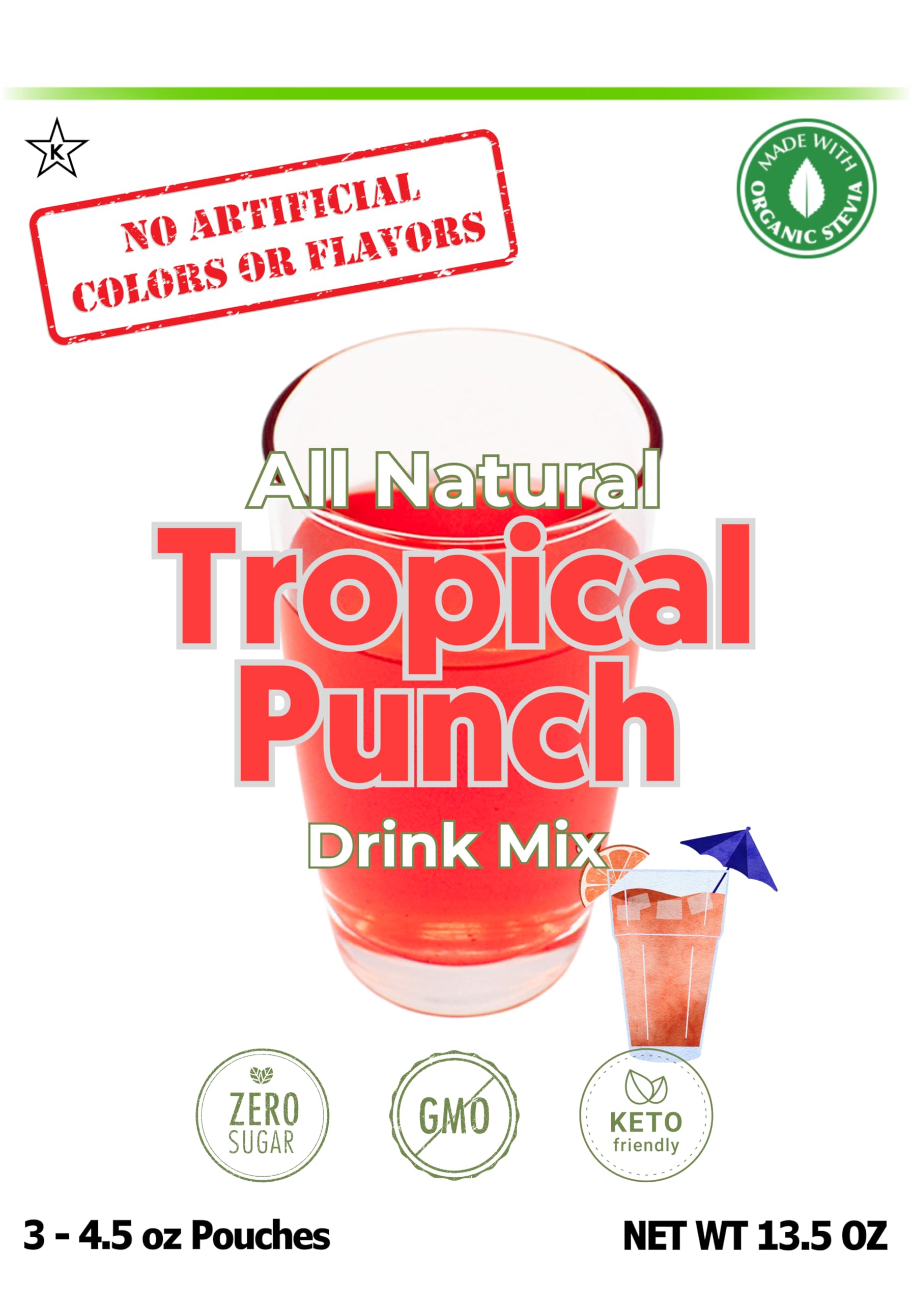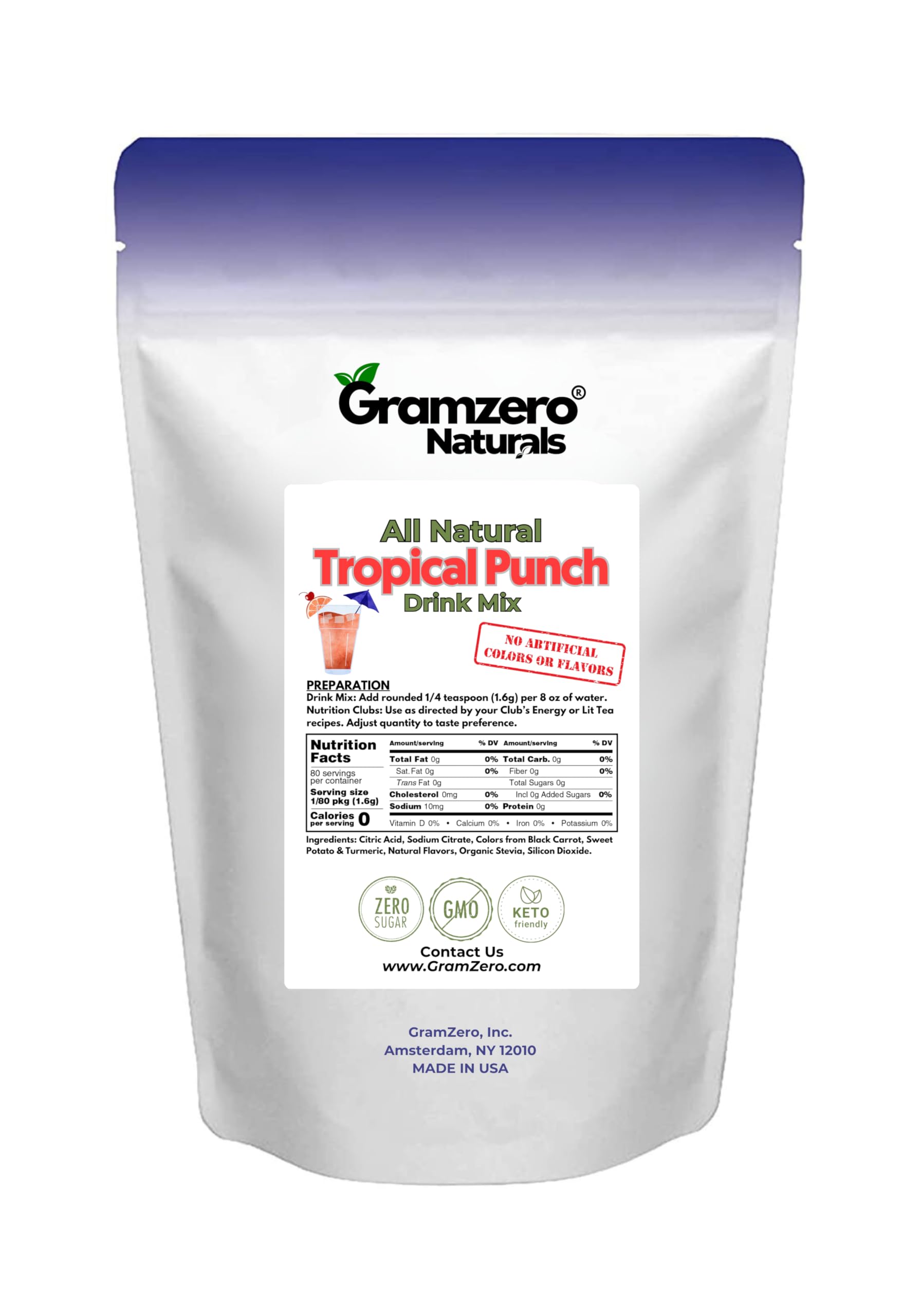 Q: What is GramZero All Natural Tropical Punch drink mix made of?A: GramZero All Natural Tropical Punch drink mix is made with non-GMO ingredients and features all natural colors and flavors, ensuring a refreshing and healthy beverage choice.