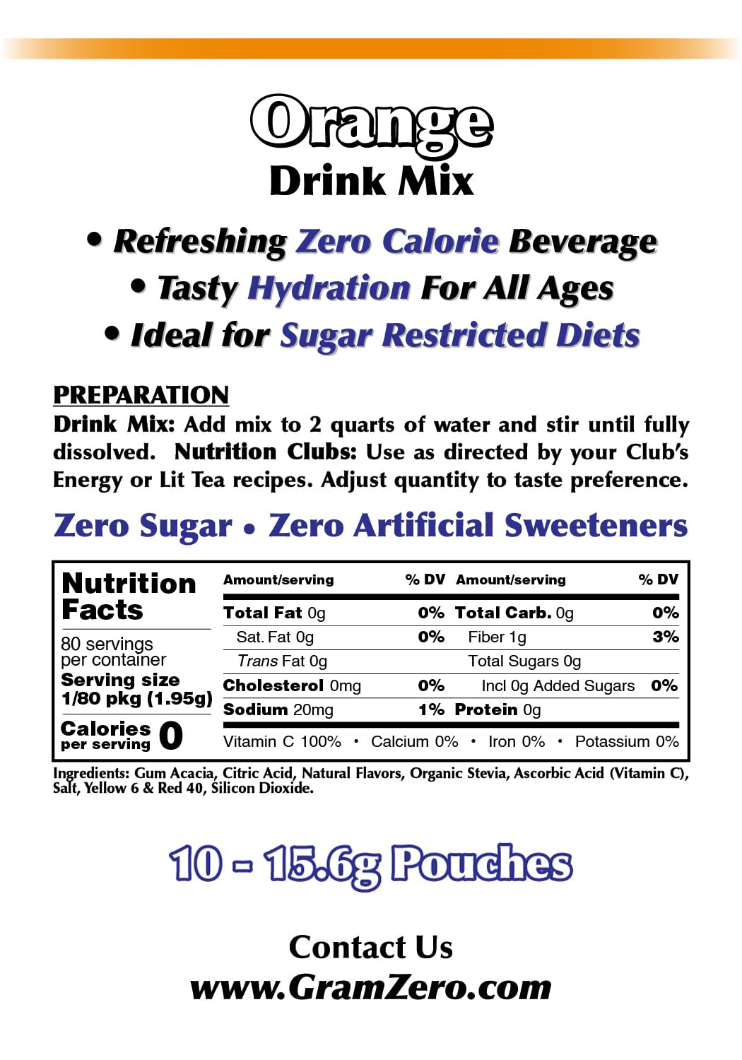 Gramzero Naturally, Sugar Free Drink Mixes Are Sweetened With Organic Stevia For The Best Low Carb Drinks! Each Sugar Free Powdered Drink Mix Tastes Just Like The Sugar Sweetened Drinks, However With No Unwanted Aftertaste, No Sugar Alcohols, No Artificial Sweeteners, And Has Zero Calories!Looking For Keto Drinks Besides Water? Youve Found The Best Organic Stevia Sweetened Drink Mix That Is Keto Friendly! Add Our Powdered Drink Mix As A Water Flavor Enhancer Or To Make One Of The Best Keto Diet Drinks! Gramzero Products Support A Ketogenic Diet And This Keto Powder Drink Mix Makes Some Of The Best Keto Beverages Around!Our Zero Calorie Drink Mixes Are Also Perfect To Flavor Loaded Tea Recipes! Build And Layer Your Energy Tea Recipe With Gramzero Drink Mix Flavors, You Wont Be Disappointed!At Gramzero, We Are A Family Owned And Operated Company. Our Mission Is To Provide Easy To Use, Great Tasting And Naturally, Sugar Free Products That Help Encourage Healthy Living! All Gramzero Products Are Sugar Free And Low Or Zero Calorie, Sweetened Naturally Only With Organic Stevia!Thank You So Much For Supporting Our Business! The Gramzero Familyinstructions - Drink Mix: Add 1/4 Teaspoon (1.6 Grams) Of This Sugar Free Drink Mix To 1 Cup (8 Fl Ounces) Of Water And Stir Until Dissolved. Adjust To Taste And Enjoy! As A Sugar Free Drink Mix, A 2.2 Ounce Pouch Makes Approximately 2 Gallons Or 32 - 8 Ounce Servings.Note: Blend As Directed For Best Flavor. Adding More Mix Than Instructed Will Not Increase Flavor, But May Add Bitterness, As Organic Stevia Is Highly Concentrated.Instructions - Nutrition Clubs: Use As Directed By Your Club'S Energy Tea Or Loaded Tea Recipe.