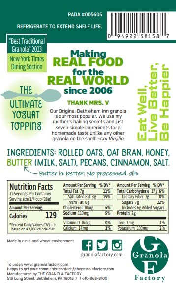 Q: What makes this granola different from others?A: What sets Granola Factory Honey Pecan apart is its commitment to using all-natural ingredients, with no artificial sweeteners or colorings. The combination of real dairy butter and whole grain rolled oats creates a rich, satisfying taste.