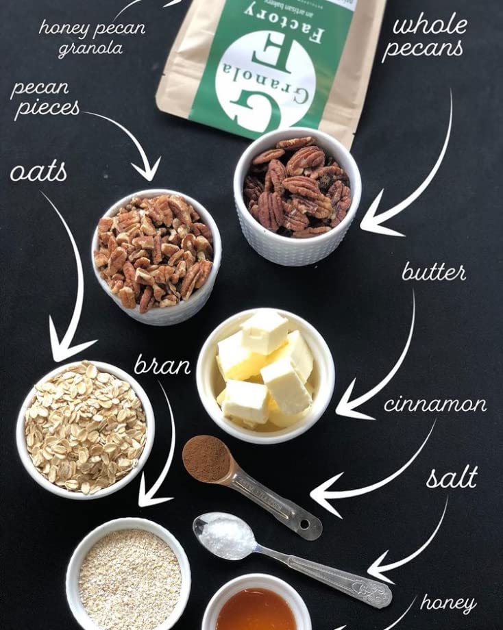 Q: What ingredients are in Granola Factory Honey Pecan?A: Granola Factory Honey Pecan is made with seven all-natural ingredients: butter, pecans, rolled oats, oat bran, honey, cinnamon, and salt. This blend is free from additives and artificial preservatives, ensuring a wholesome snack.
