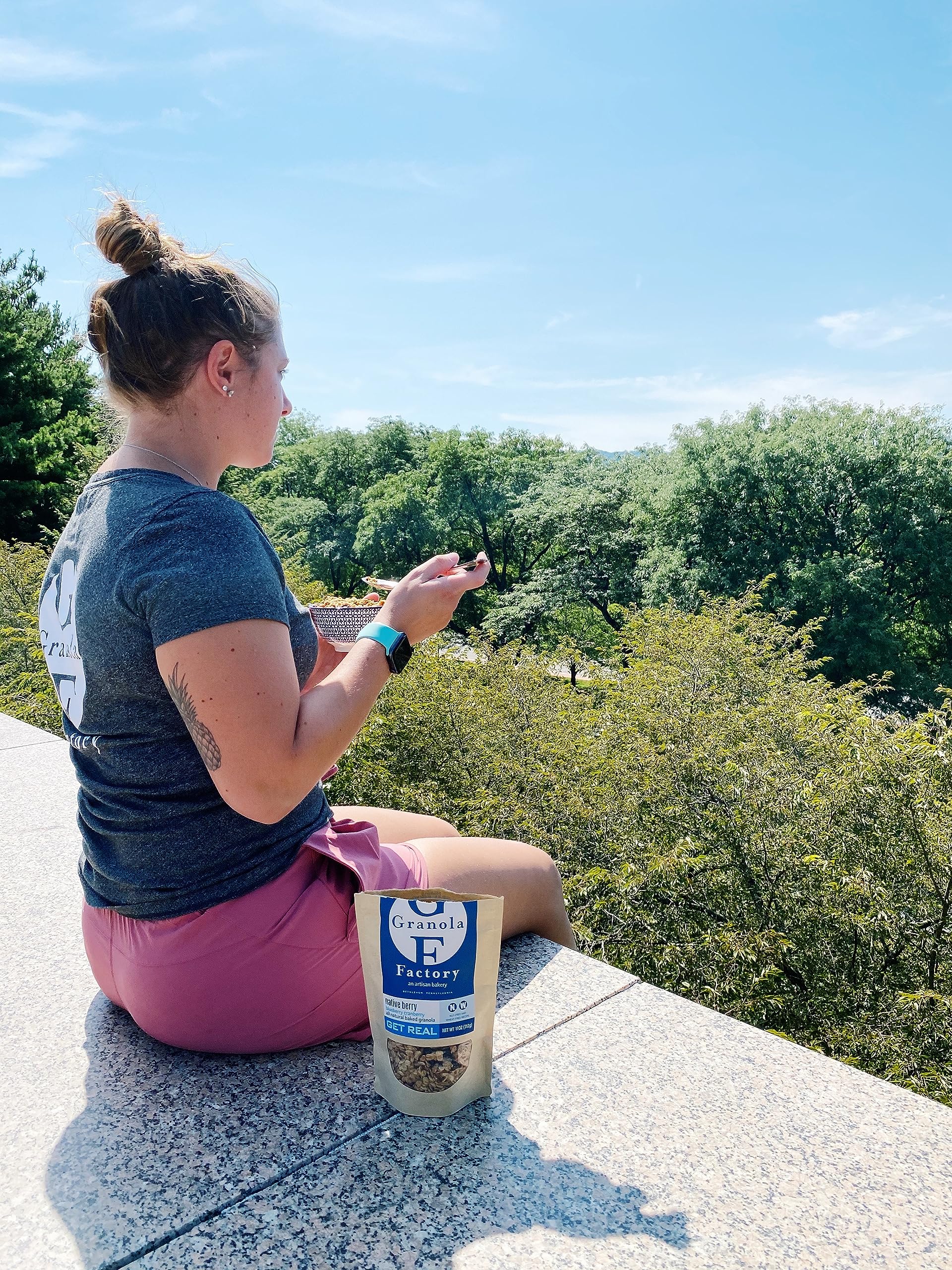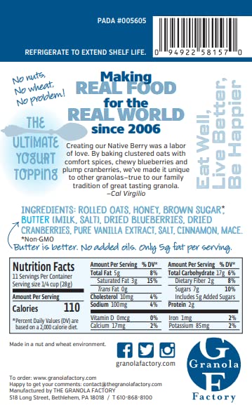 Q: What are the main ingredients in Granola Factory Native Berry?A: Granola Factory Native Berry is made with all-natural ingredients including rolled oats, dried blueberries, dried cranberries, and real butter. There are no artificial sweeteners or colorings, ensuring a wholesome snack.