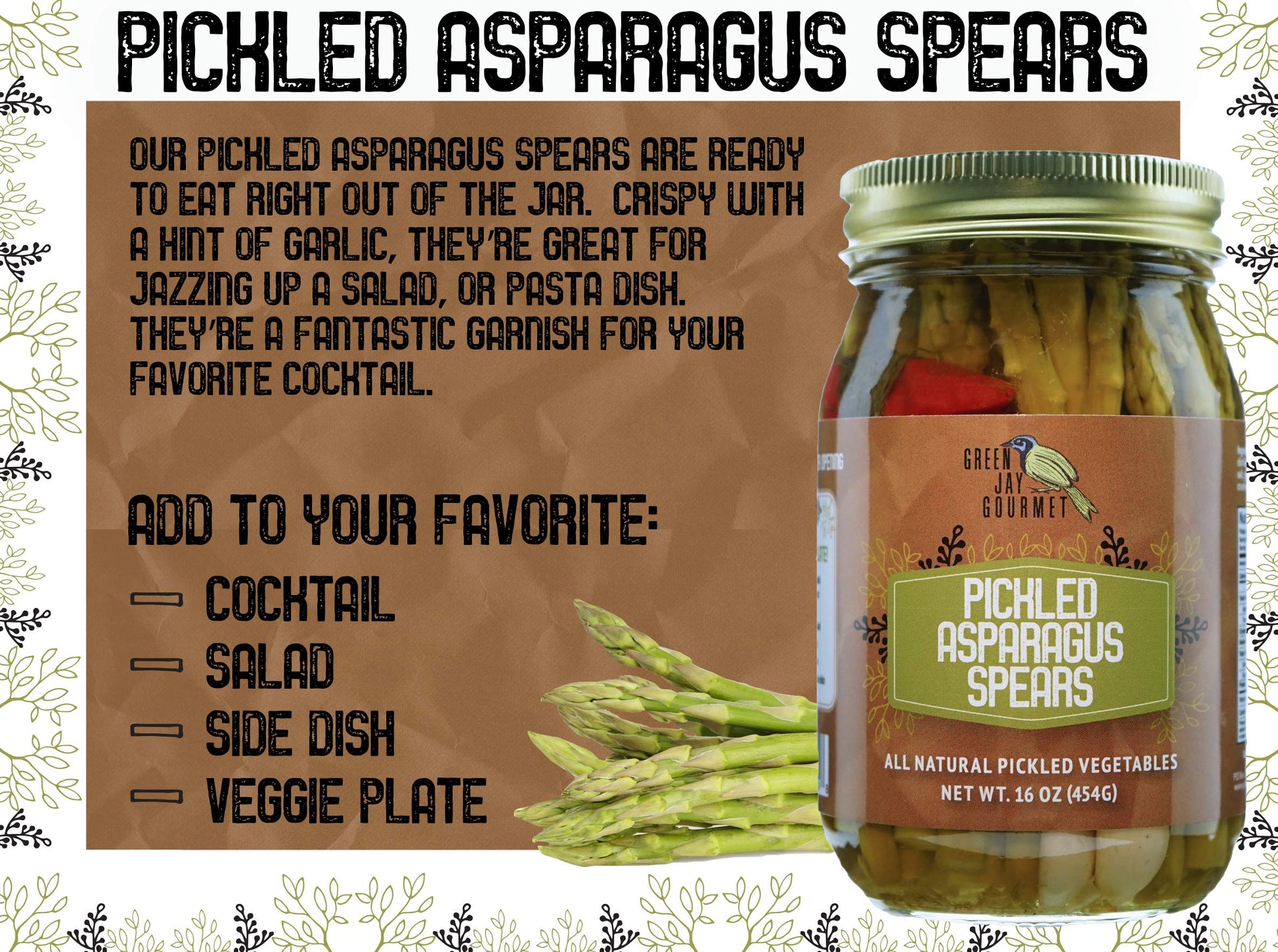 Q: What are the ingredients used in the pickled asparagus spears?A: Our pickled asparagus spears are made using simple, natural ingredients that are kitchen staples. We do not use any preservatives or stabilizers, ensuring you enjoy a delicious and wholesome product.