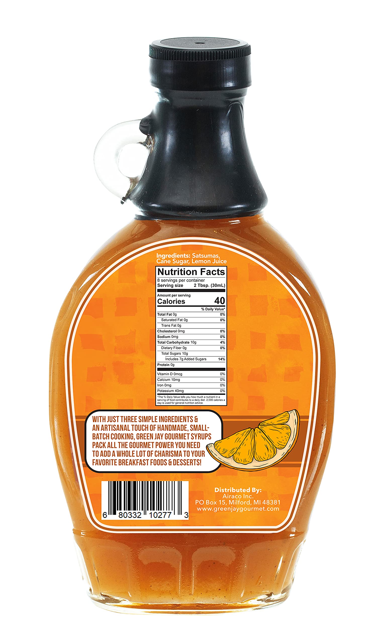 Q: How can I use Green Jay Gourmet Satsuma Orange Syrup?A: You can use this delicious syrup as a pancake syrup, waffle syrup, or dessert syrup. It's perfect for enhancing the flavors of your breakfast foods, adding a gourmet touch to your dishes.