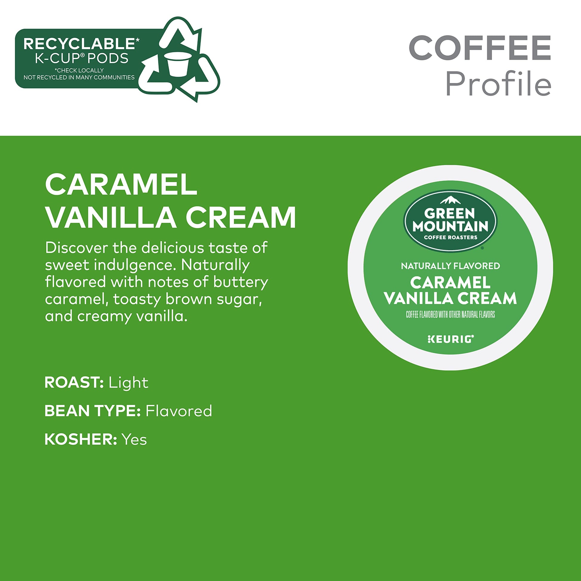 Q: What flavors can I expect from Green Mountain Coffee Roasters Caramel Vanilla Cream K-Cup Pods?A: The Green Mountain Coffee Roasters Caramel Vanilla Cream K-Cup Pods feature a delightful blend of caramel, toasty brown sugar, and vanilla cream flavors, providing a luxurious taste experience that resembles a dessert in a coffee cup.