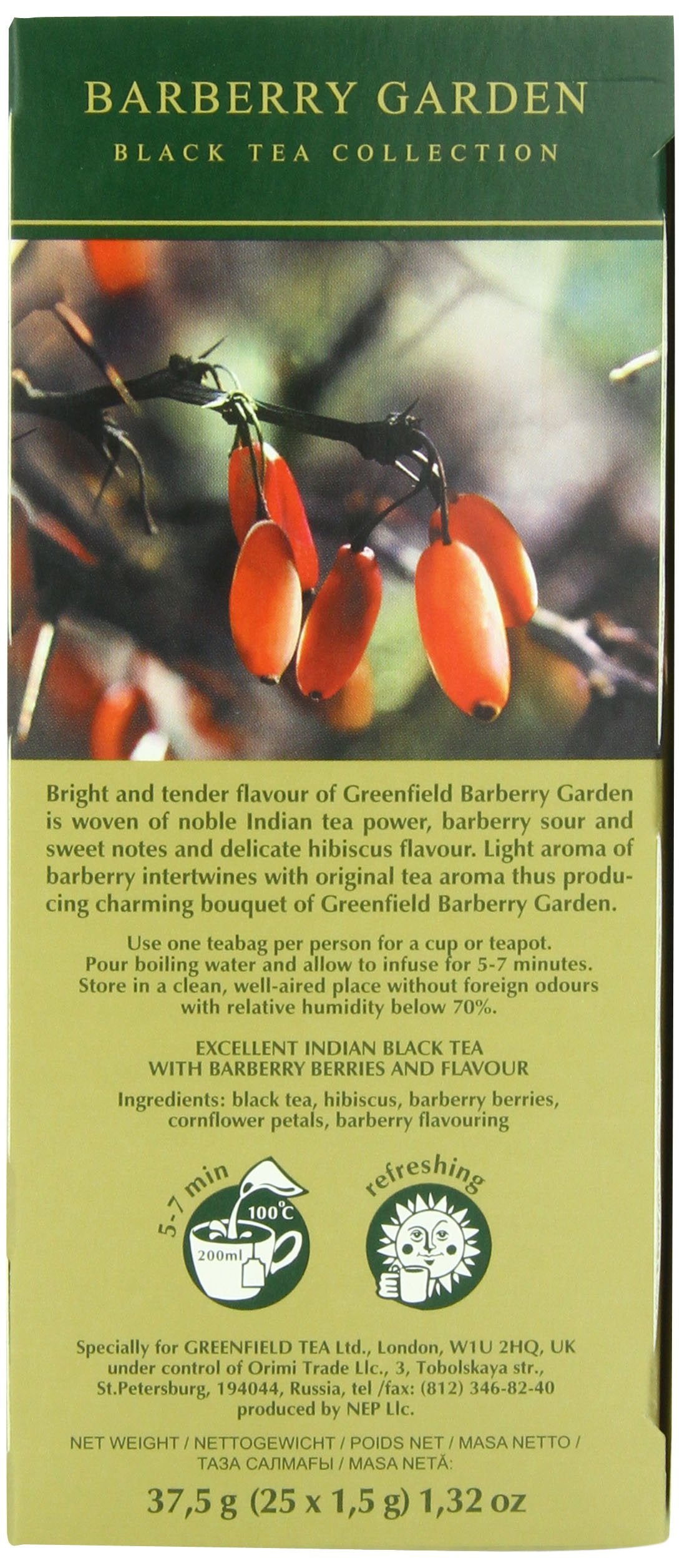 - Q: How do I prepare Greenfield Barberry Garden tea? A: To prepare Greenfield Barberry Garden tea, simply take one tea bag, pour boiling water over it in a cup or teapot, and let it brew for 5-7 minutes for optimal flavor.