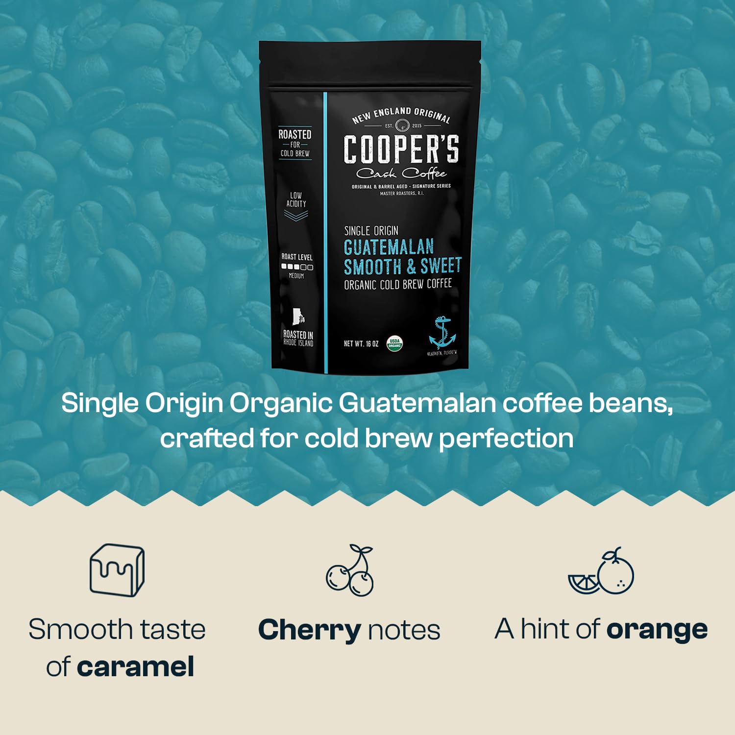 - Q: What makes Cooper's Cask Guatemala Organic Cold Brew Coffee unique? A: Cooper's Cask Guatemala Organic Cold Brew Coffee is unique due to its single-origin beans sourced from the high elevations of Guatemala, where the subtropical climate and nutrient-rich soil produce exceptional coffee. The careful small-batch roasting process enhances the natural flavors, resulting in a well-balanced medium roast that features tasting notes of milk chocolate, creamy caramel, and a hint of orange.