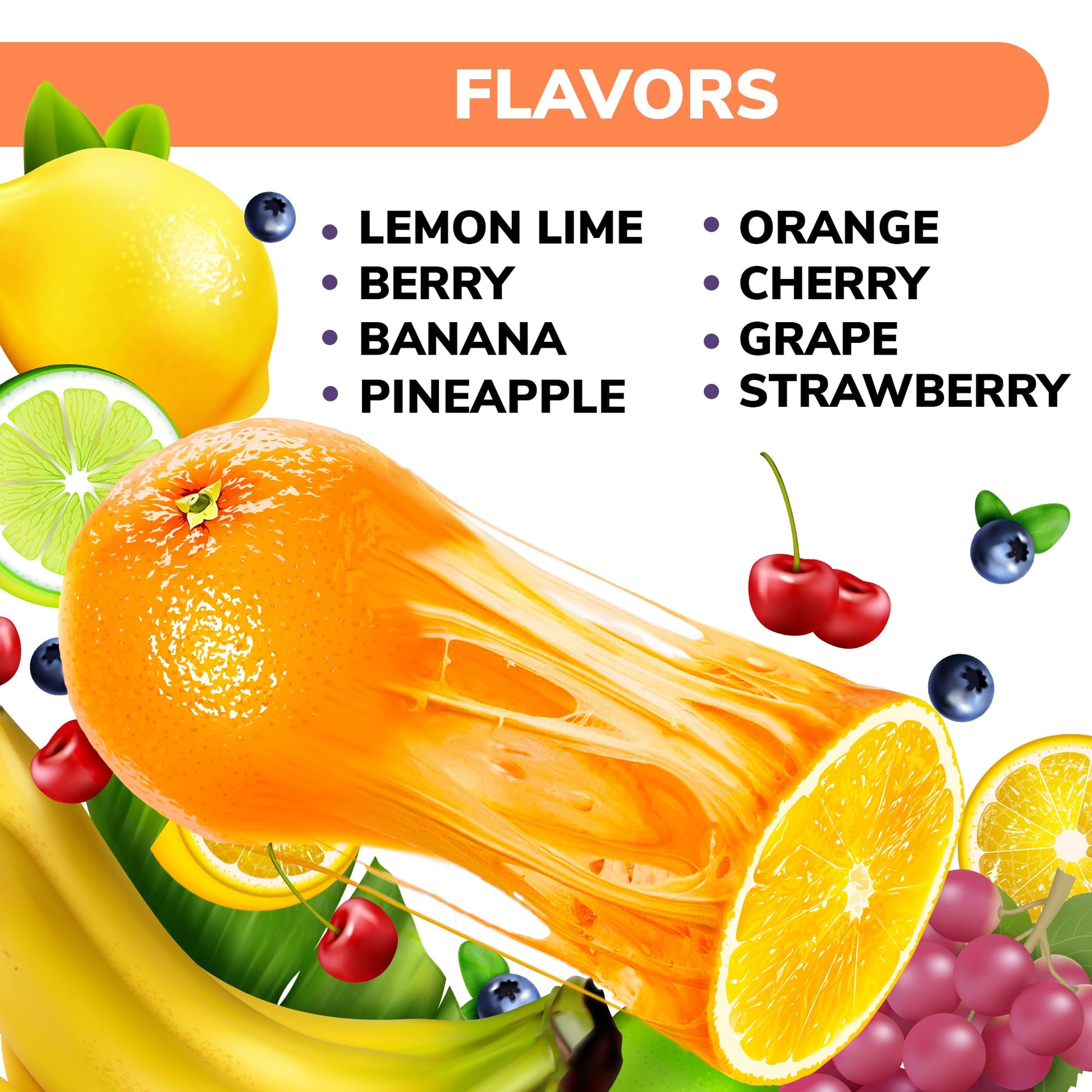Q: What flavors do the gumballs come in?A: Our gumballs are available in a delightful assortment of 8 fruit flavors: Pineapple, Banana, Orange, Strawberry, Cherry, Lemon-Lime, Berry, and Grape. Each chew provides a burst of fruity goodness!