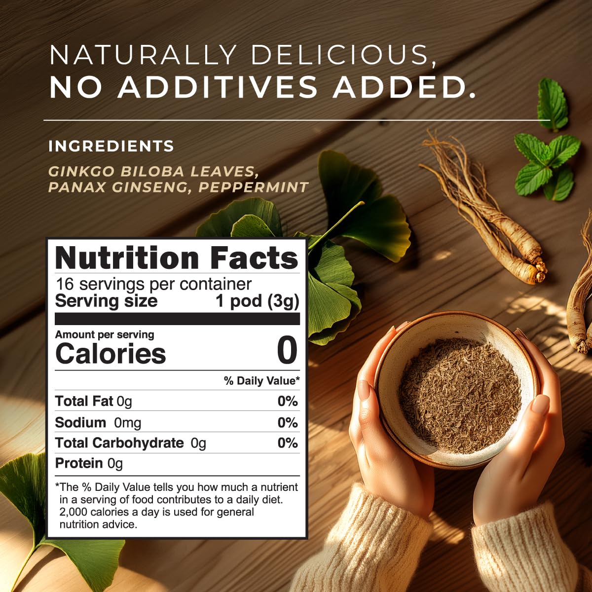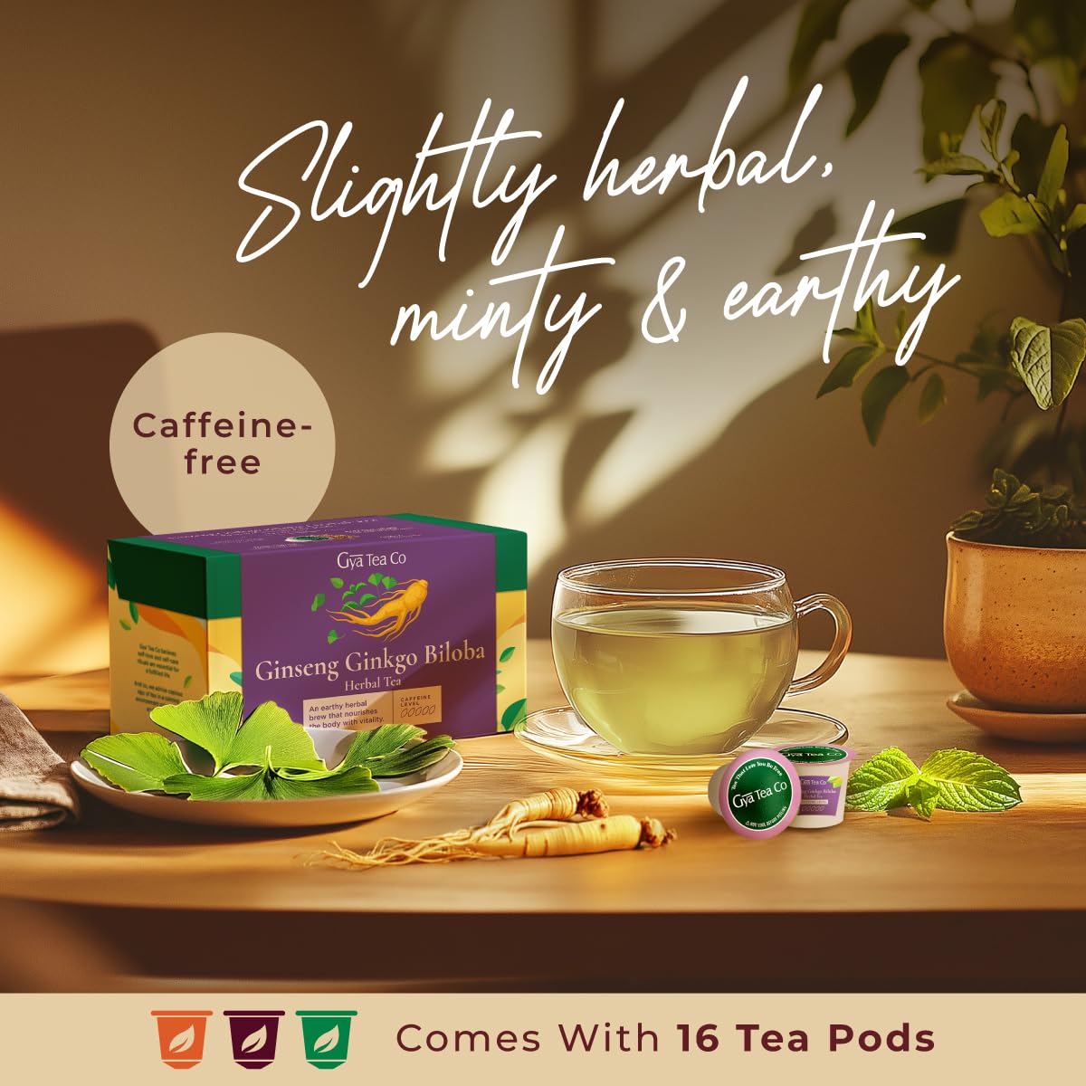 Q: What are the main ingredients in Gya Tea Co Ginkgo Biloba and Ginseng Herbal Tea Pods?A: Gya Tea Co Ginkgo Biloba and Ginseng Herbal Tea Pods are made from 100% pure natural ingredients, including ginkgo biloba leaves, panax ginseng, and peppermint, all of which are manually harvested to ensure quality.