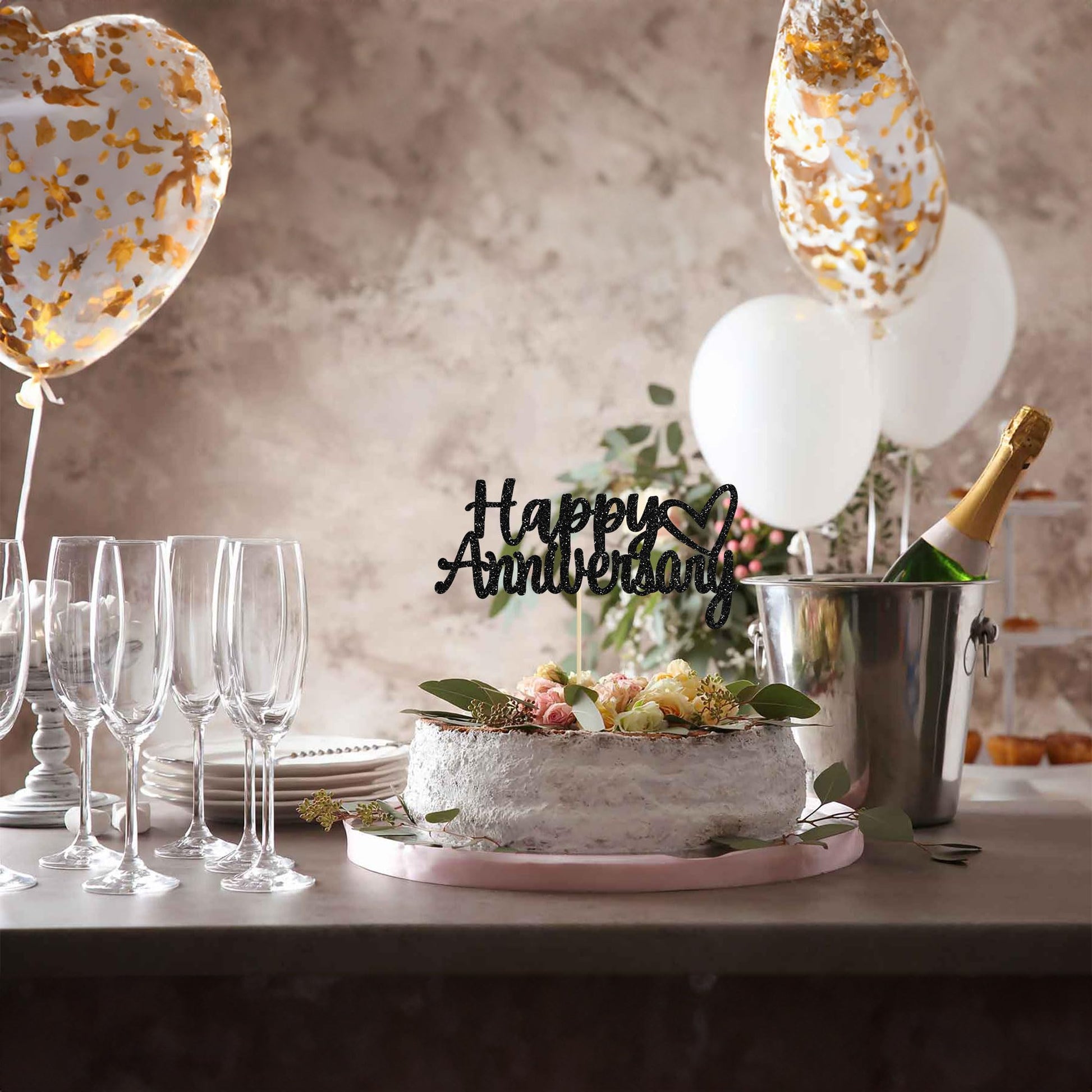 Q: What materials are used in the Gyufise Black Glitter Happy Anniversary Cake Topper?A: The Gyufise Black Glitter Happy Anniversary Cake Topper is made of high-quality paper and features a food-grade toothpick, ensuring it is safe for decoration on cakes, cupcakes, and other desserts.