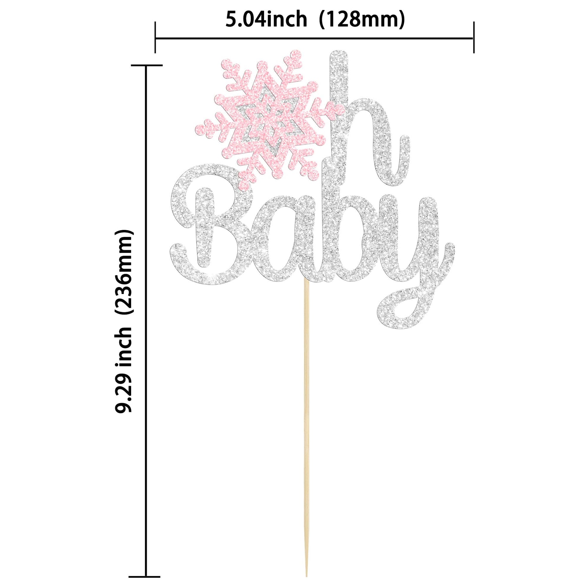 Q: What is the size of the Gyufise Oh Baby Snowflake Cake Topper?A: The Gyufise Oh Baby Snowflake Cake Topper measures approximately 5 inches in width and 7.9 inches in height (12.7 cm x 20 cm including the stick).
