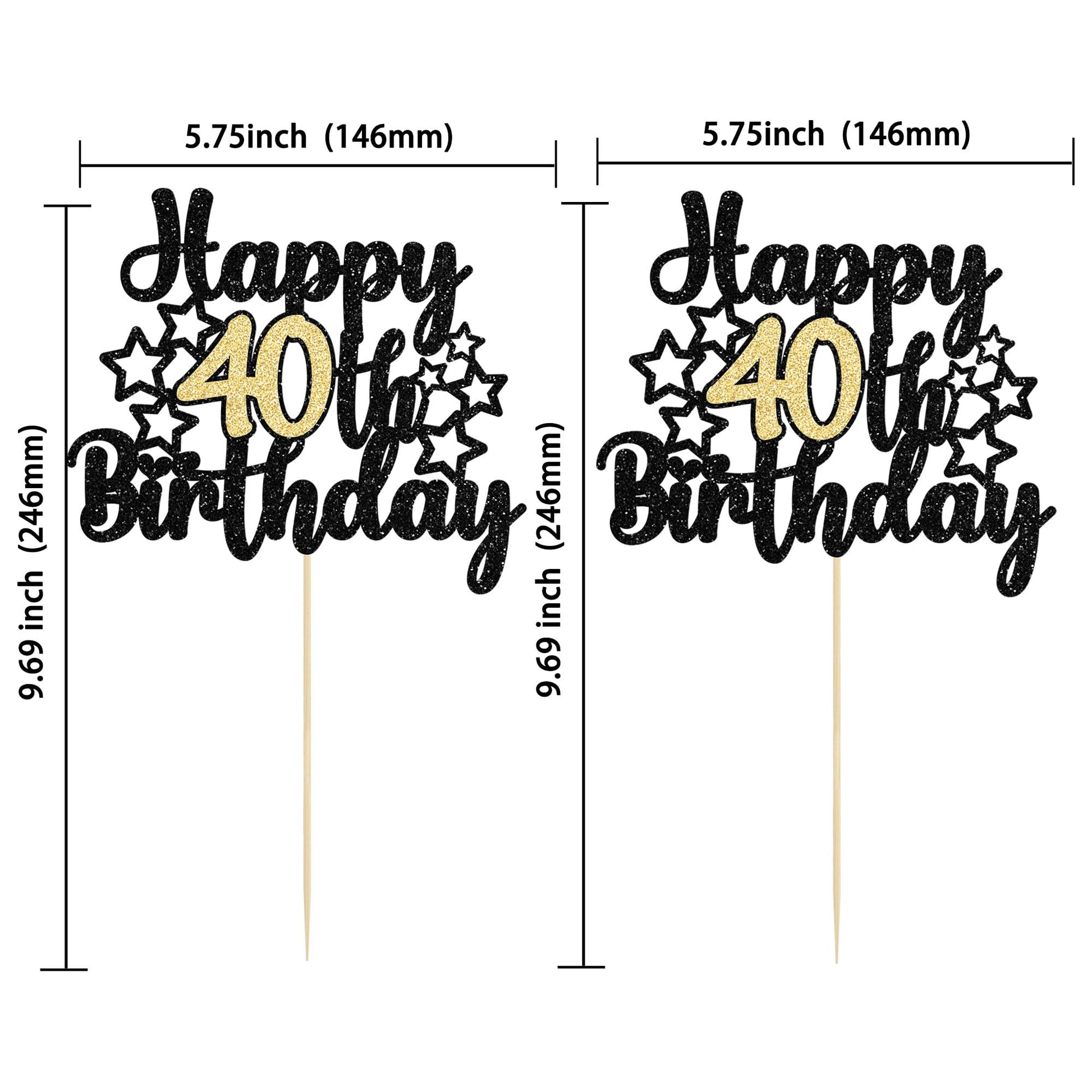 Q: What is the size of the Happy 40th Birthday Cake Topper?A: The Happy 40th Birthday Cake Topper measures approximately 6.5 inches wide by 9.1 inches high (16.5 cm by 23 cm including the stick).