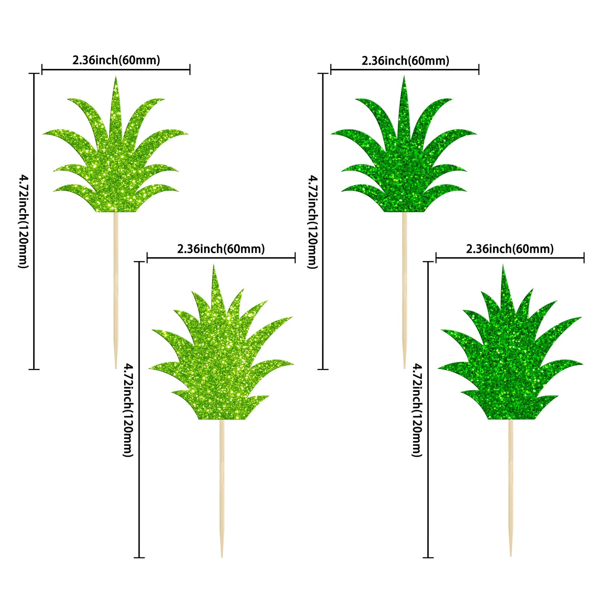 Q: What are the dimensions of the Gyufise Pineapple Cupcake Toppers?A: The Gyufise Pineapple Cupcake Toppers measure approximately 2.4 inches in width and 4.4 inches in height (6 cm x 11.2 cm including the stick).