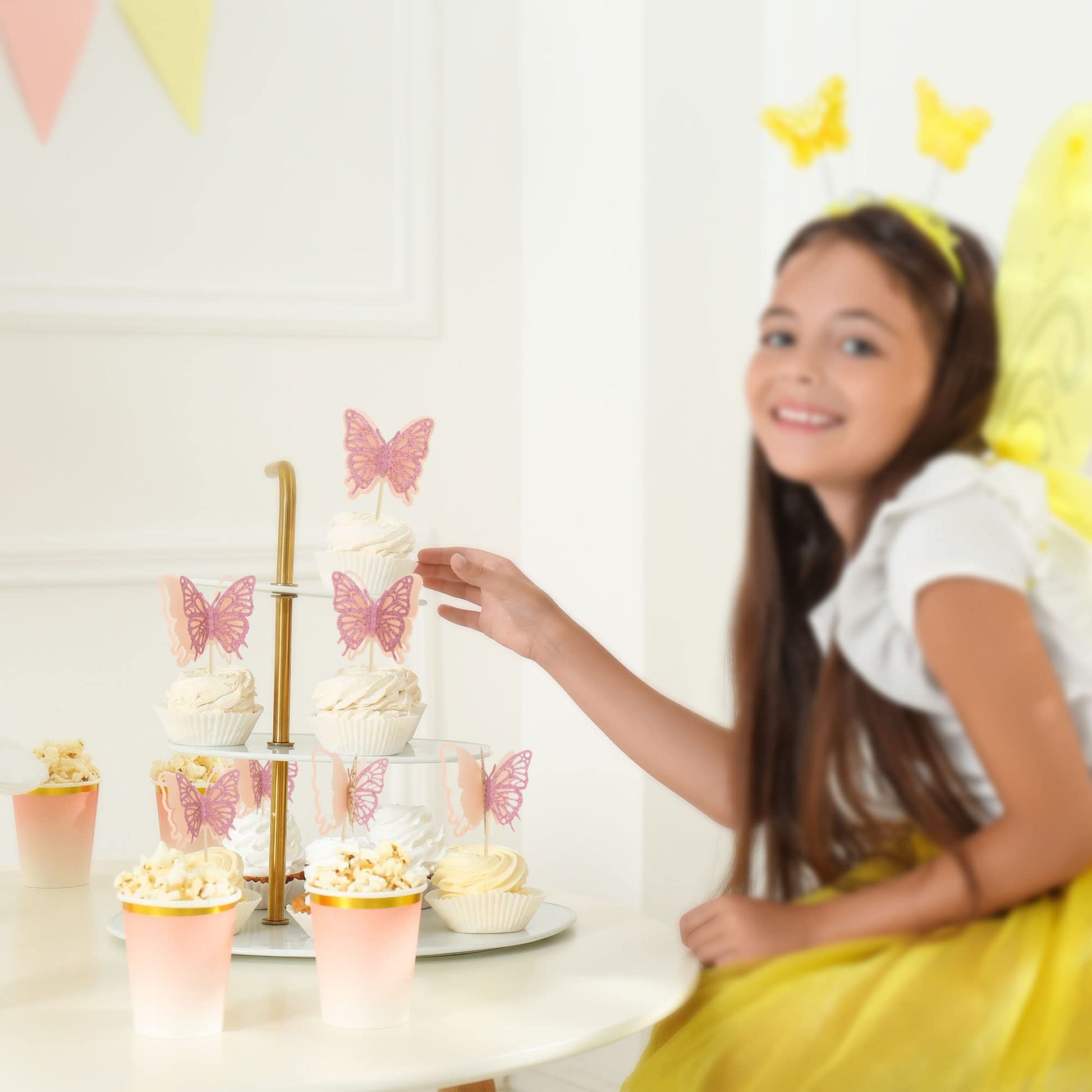 Q: What are the dimensions of the Gyufise Pink Glitter Butterfly Cupcake Toppers?A: Each cupcake topper measures approximately 2.6 inches wide and 4.9 inches high, including the stick. There is also a larger size option available, measuring 6.5 inches wide and 12.4 inches high.