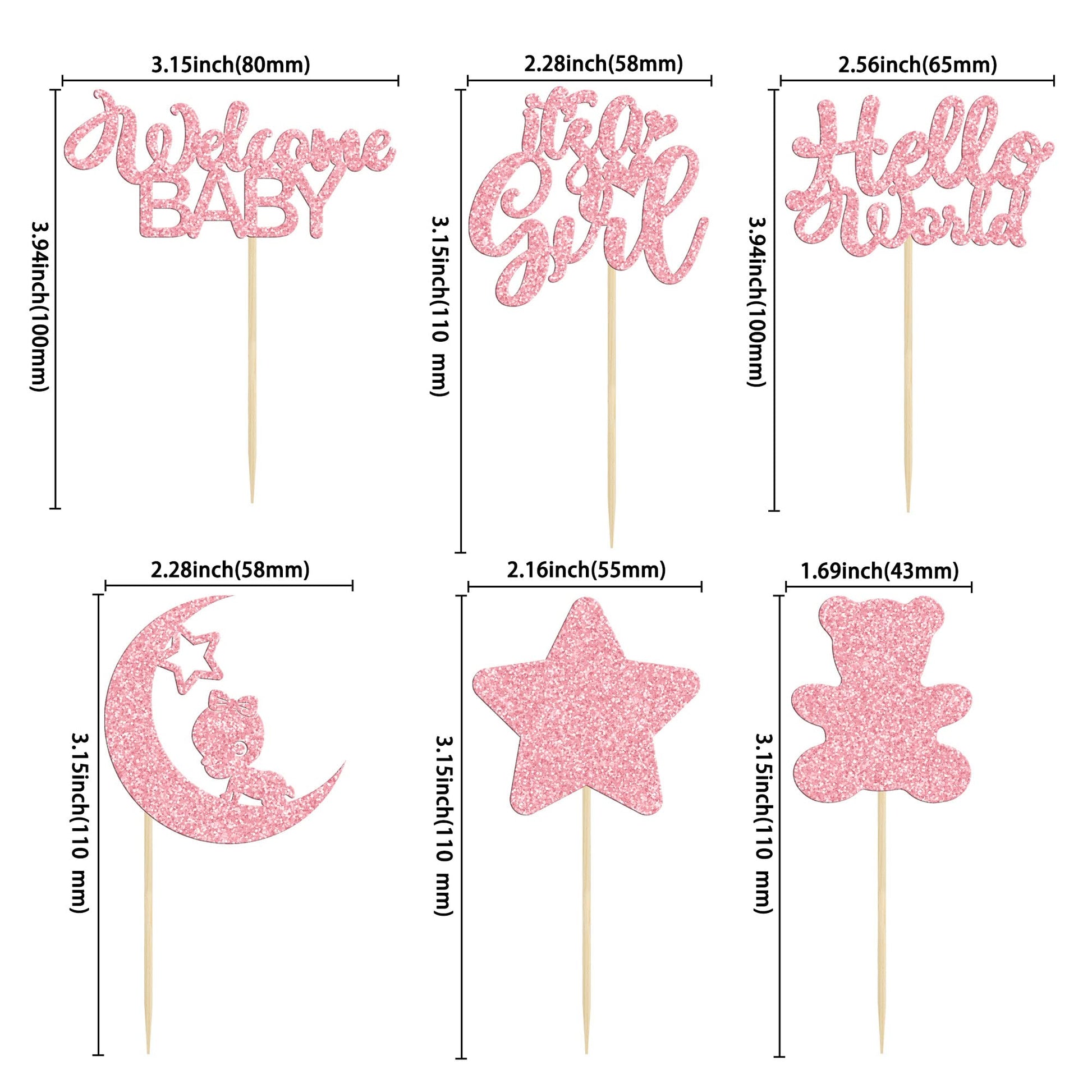 Q: What are the dimensions of the Gyufise Baby Girl Cupcake Toppers?A: The Gyufise Baby Girl Cupcake Toppers measure W 2.3 inches by H 4.6 inches (W 5.8 cm by H 11.7 cm including the stick).