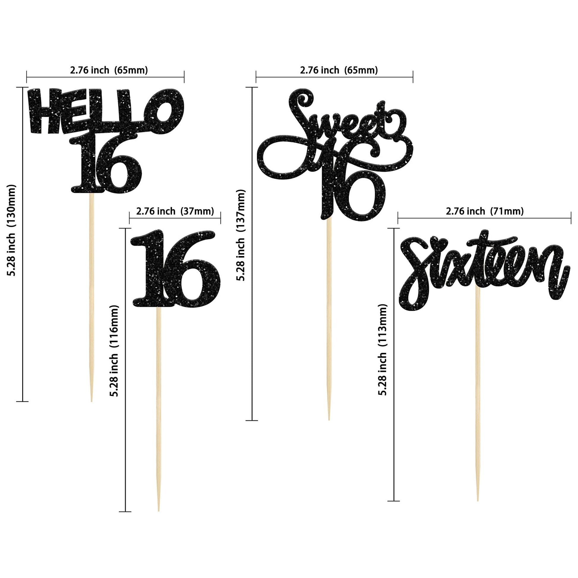 • Q: What are the dimensions of the Gyufise 16th Birthday Cupcake Toppers? A: The Gyufise 16th Birthday Cupcake Toppers measure W 2.6 inches by H 4.8 inches, and the larger size is W 6.5 inches by H 12.2 inches, including the stick.